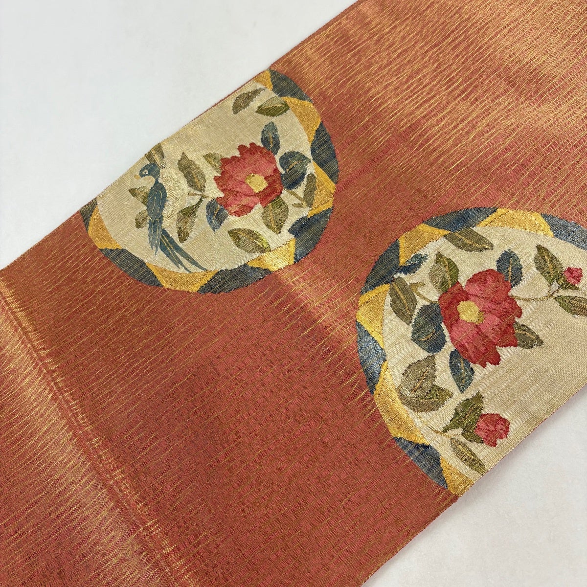 袋帯 秀品 草花 間垣 金銀糸 唐織 オレンジ お太鼓柄 正絹