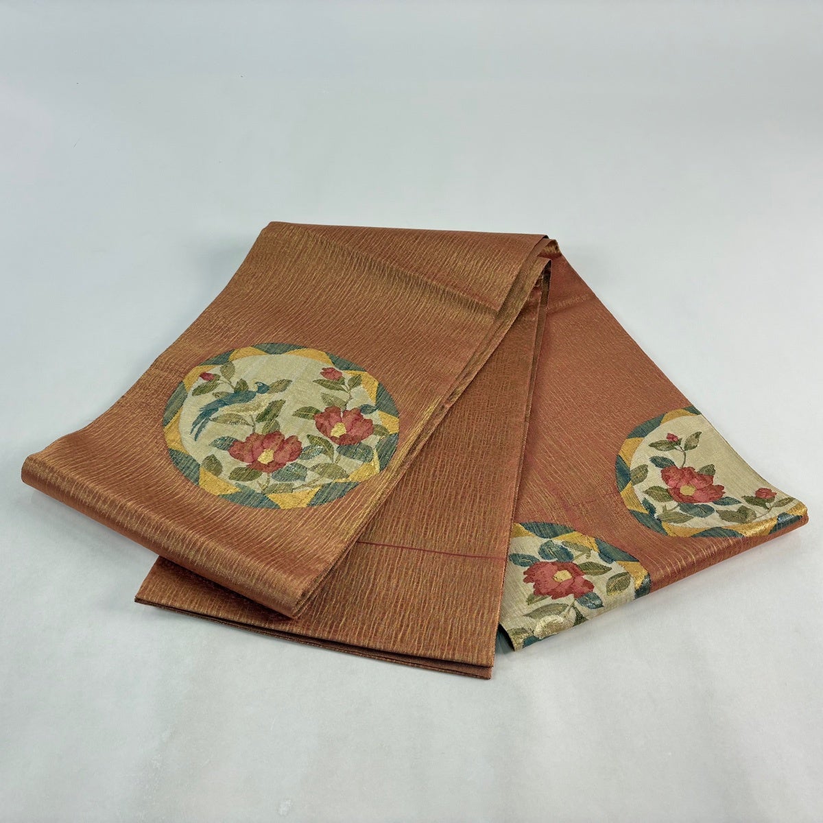 袋帯 秀品 山城機業店 草花 雪輪 唐織 オレンジ 全通 正絹