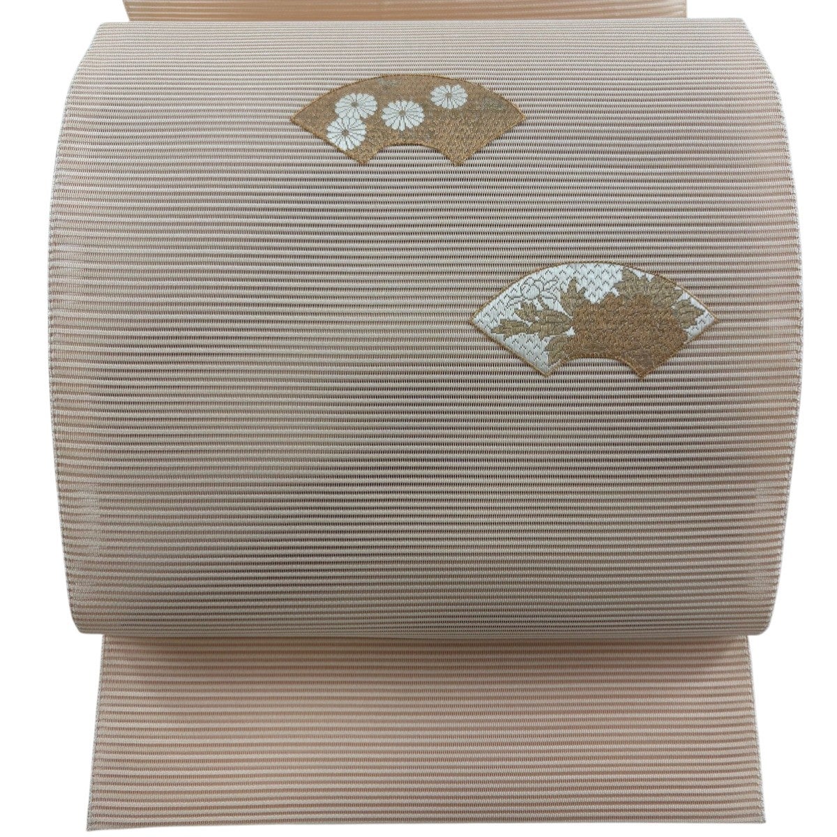 【美品】 袋帯 秀品 紬地 扇 華文 刺繍 薄オレンジ お太鼓柄 正絹