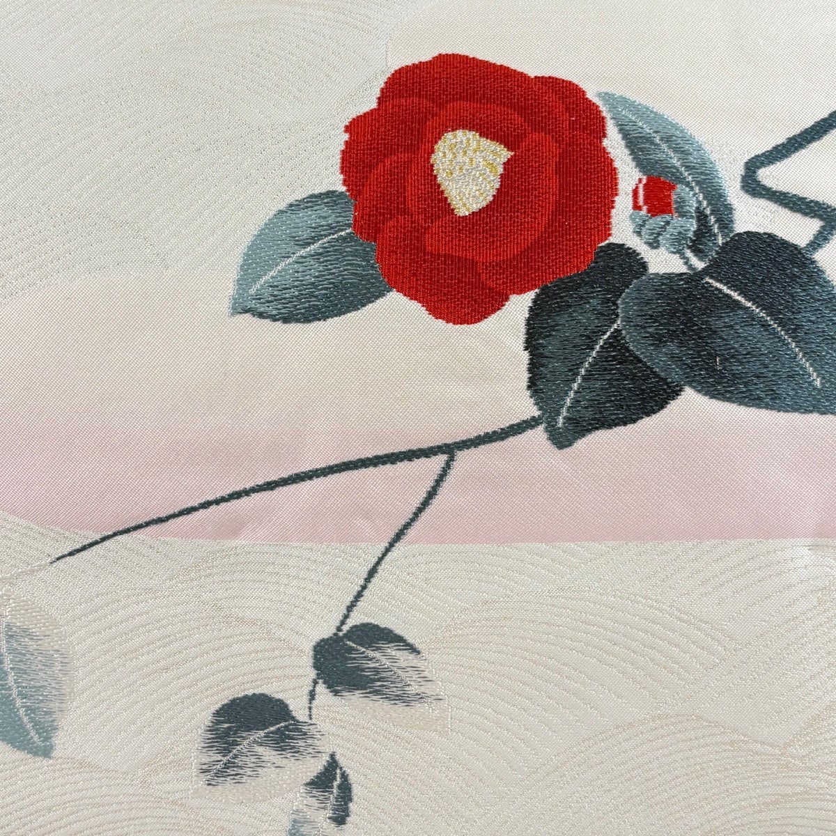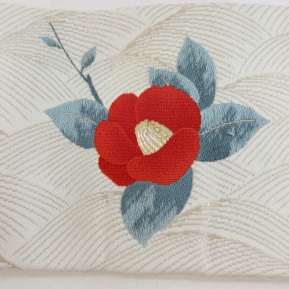 名古屋帯 名品 草花 菱 銀彩 縮緬 クリーム 正絹