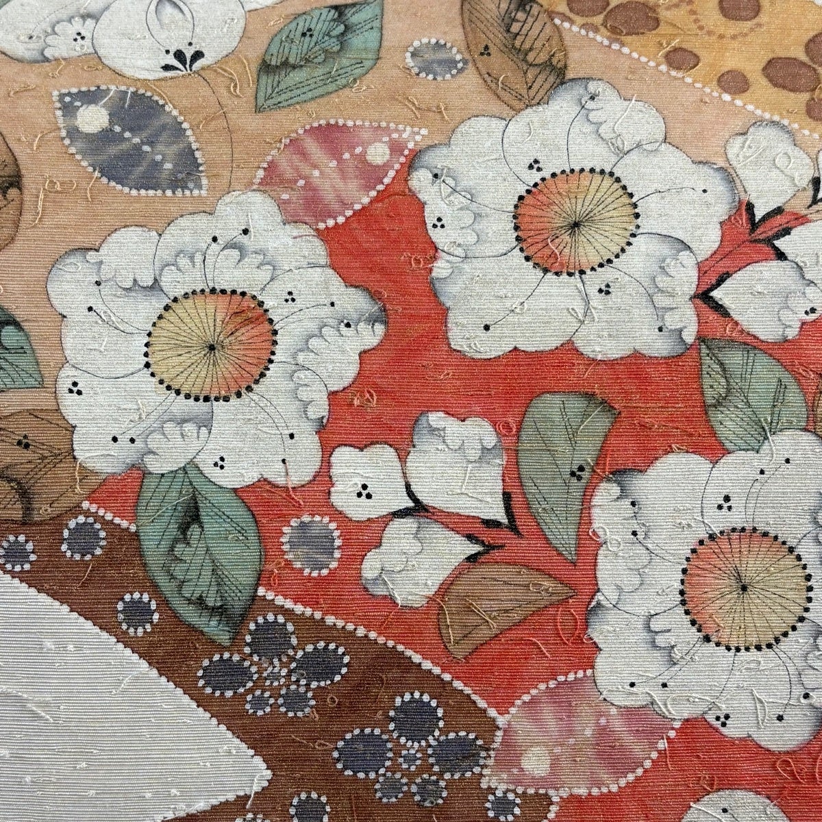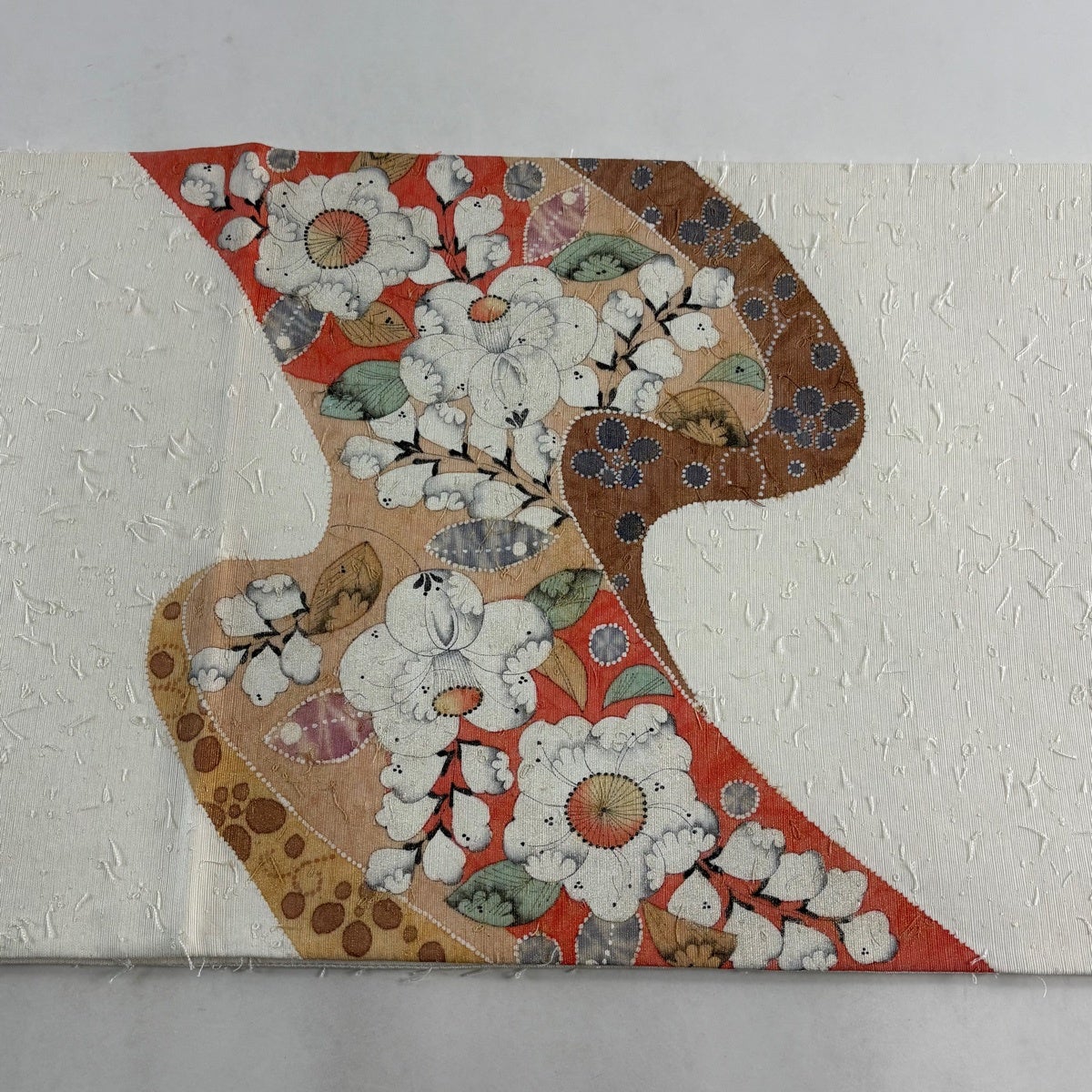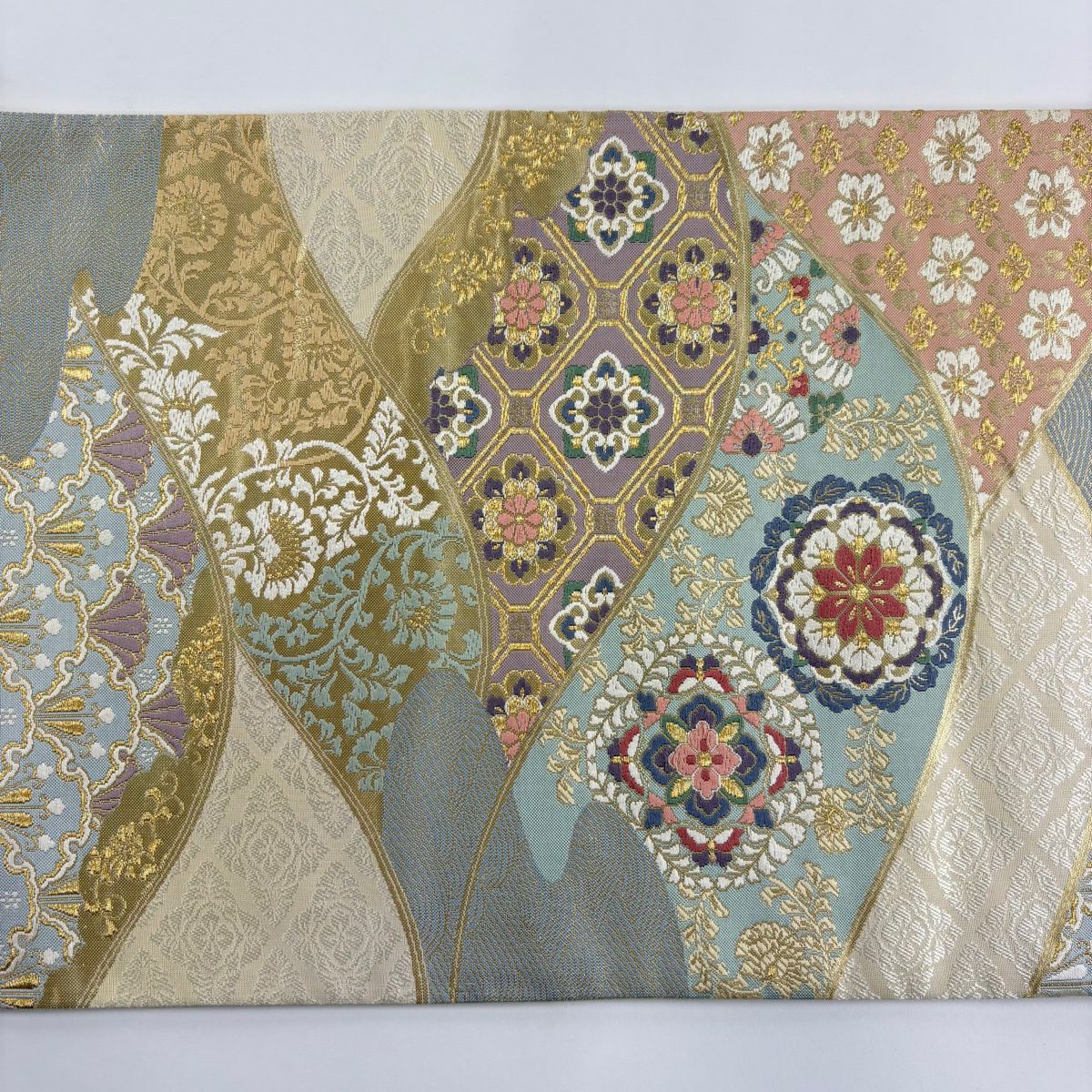 【美品】 袋帯 秀品 花柄 幾何学模様 箔 銀糸 クリーム 六通 正絹