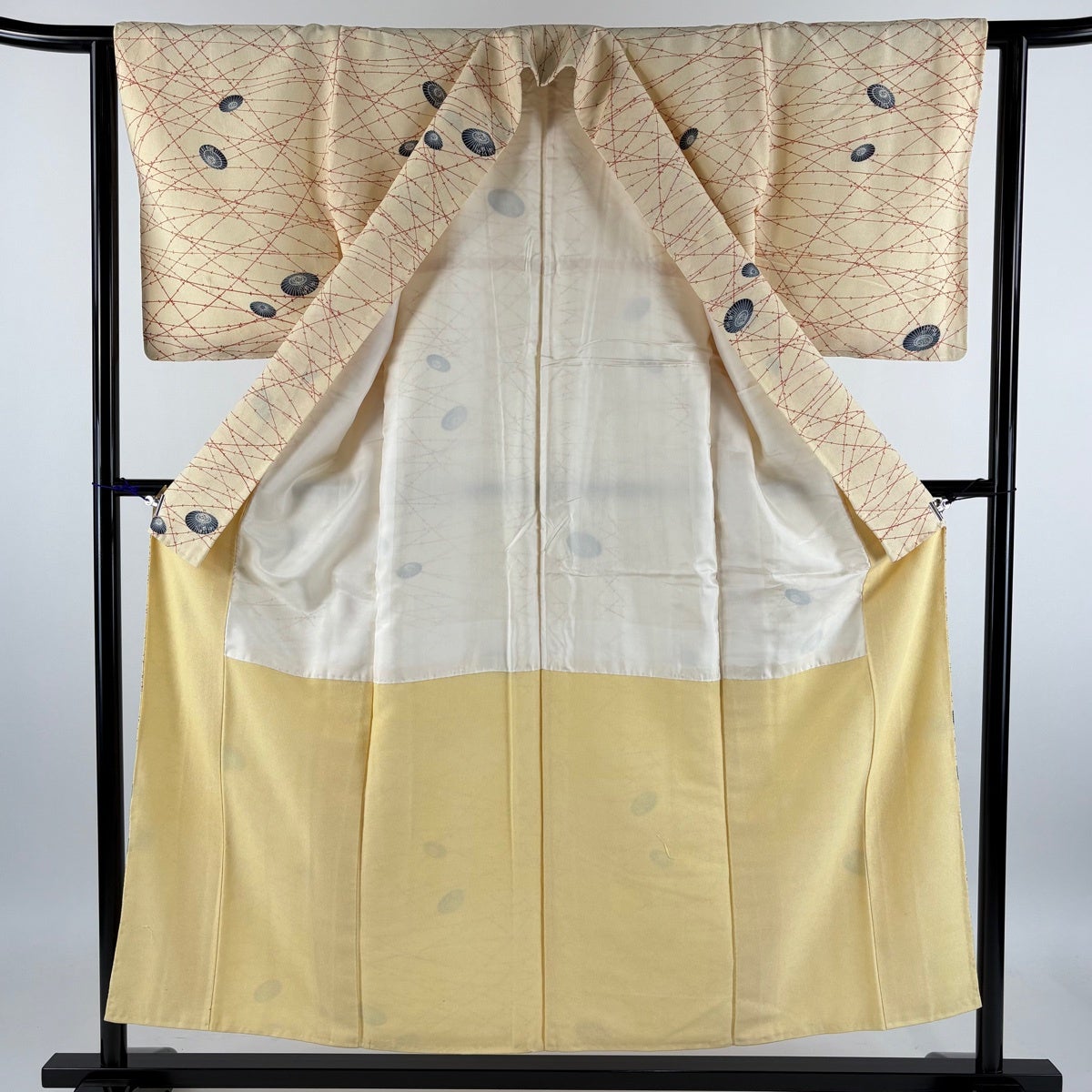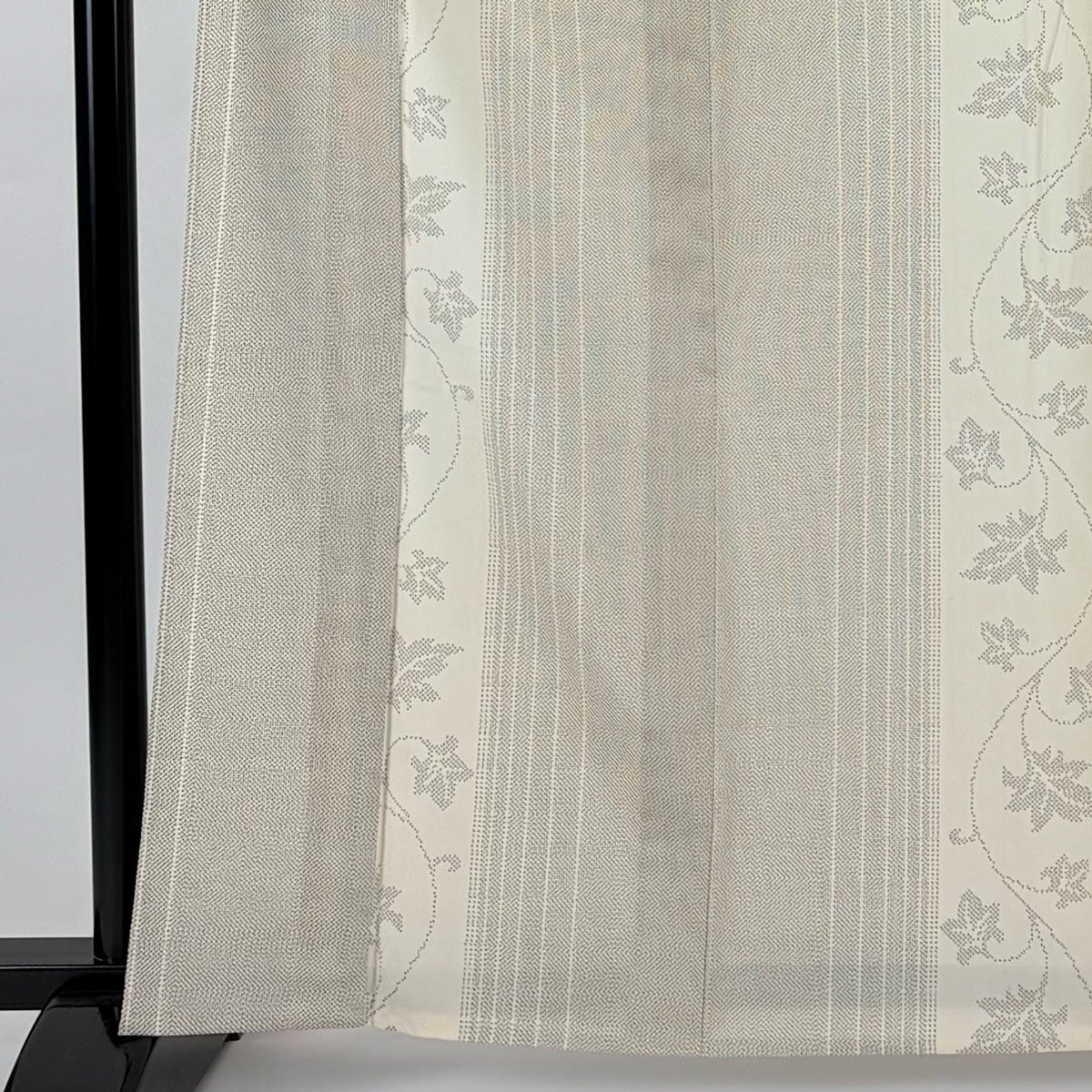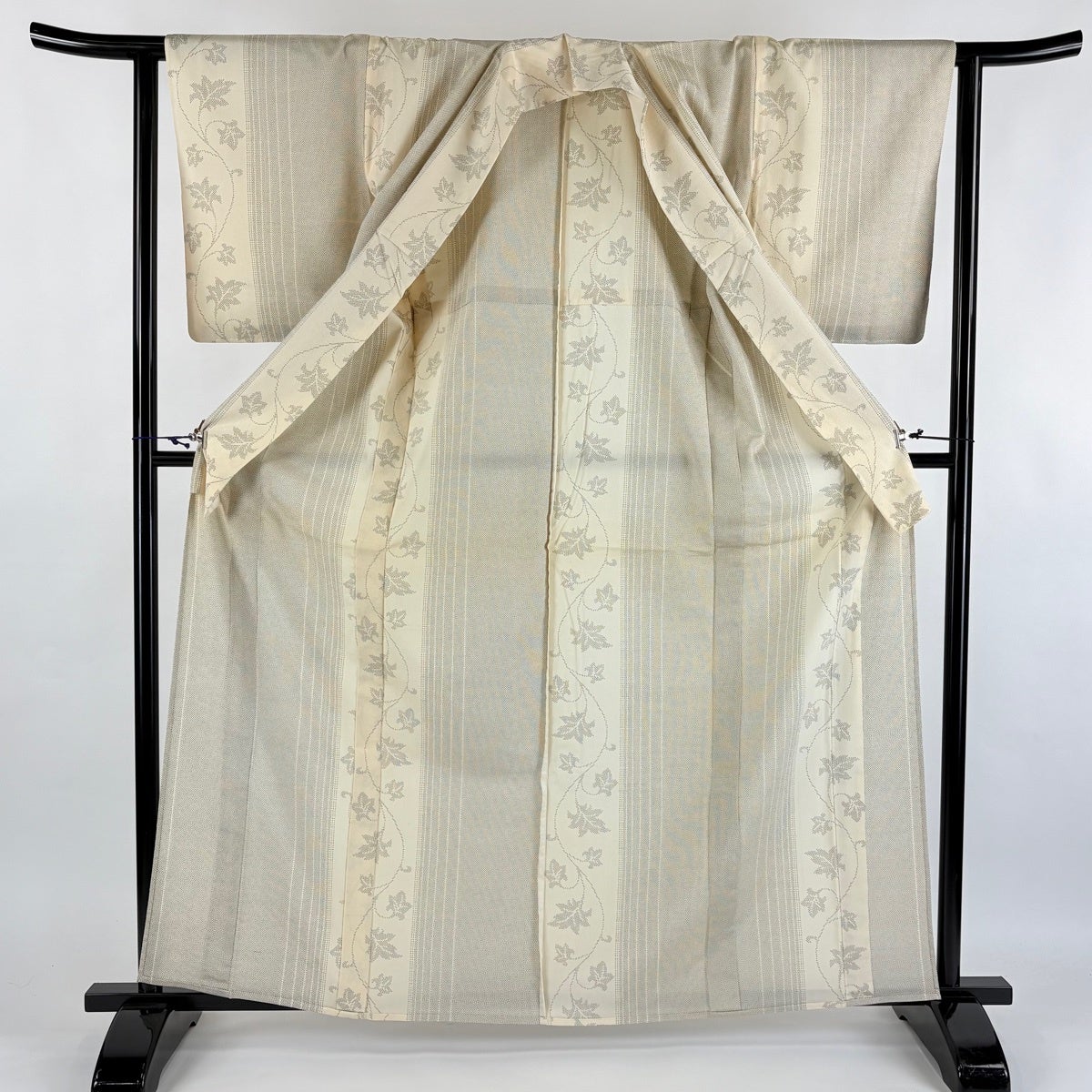 紬 身丈163.5cm 裄丈62cm S 単衣 唐草 縦縞 クリーム 正絹 秀品