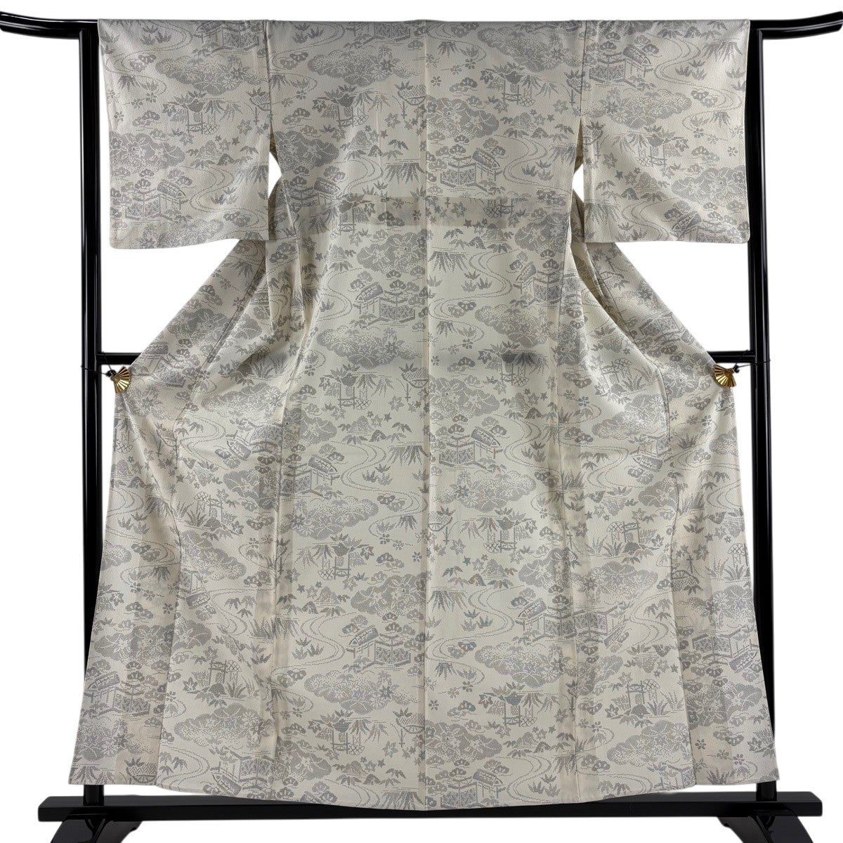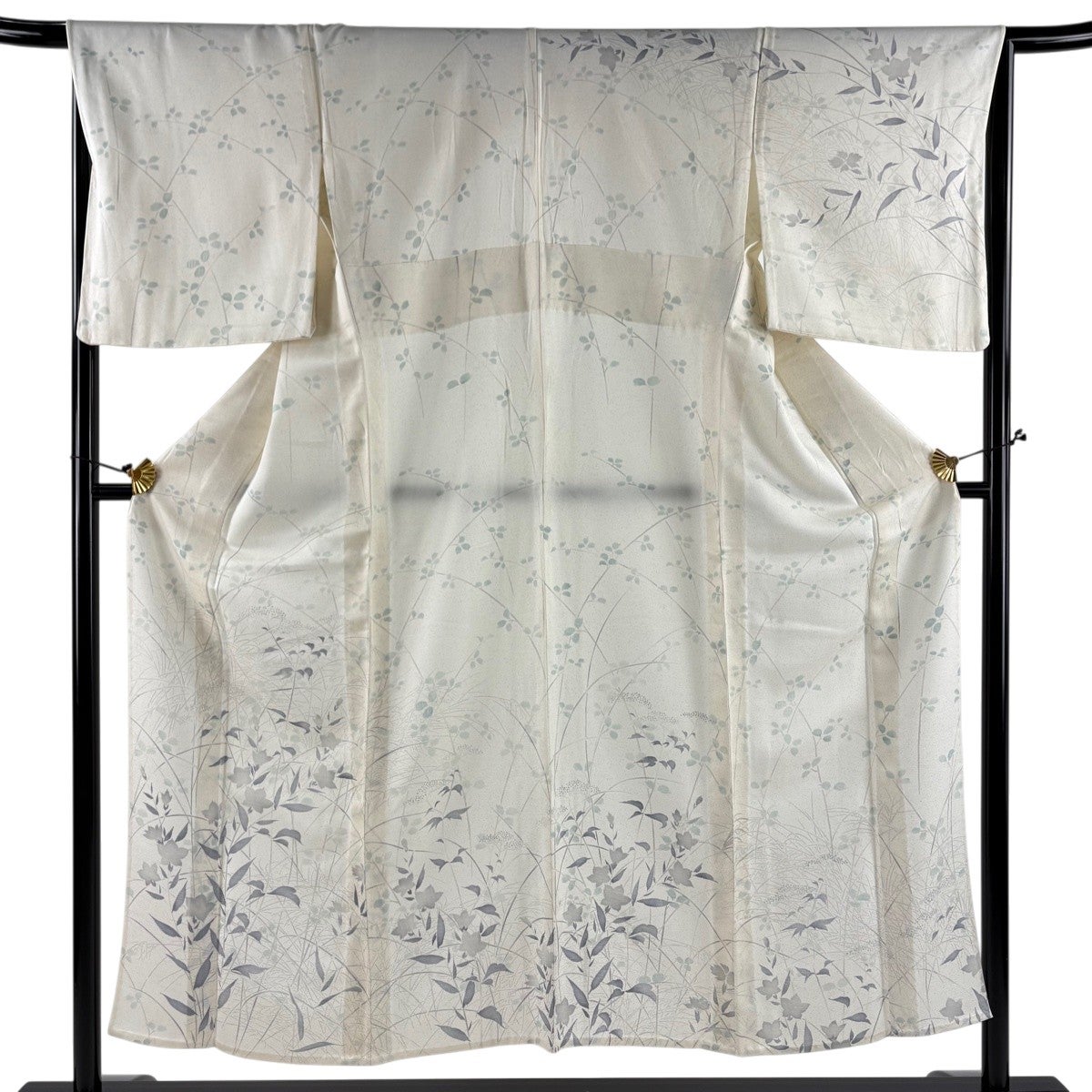 紬 身丈159cm 裄丈63.5cm S 単衣 草花 雲文 クリーム 正絹 秀品