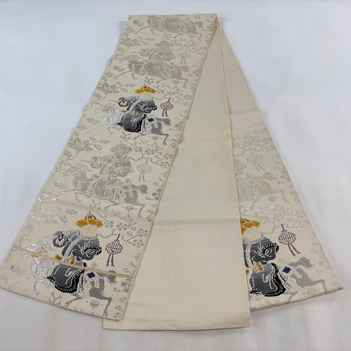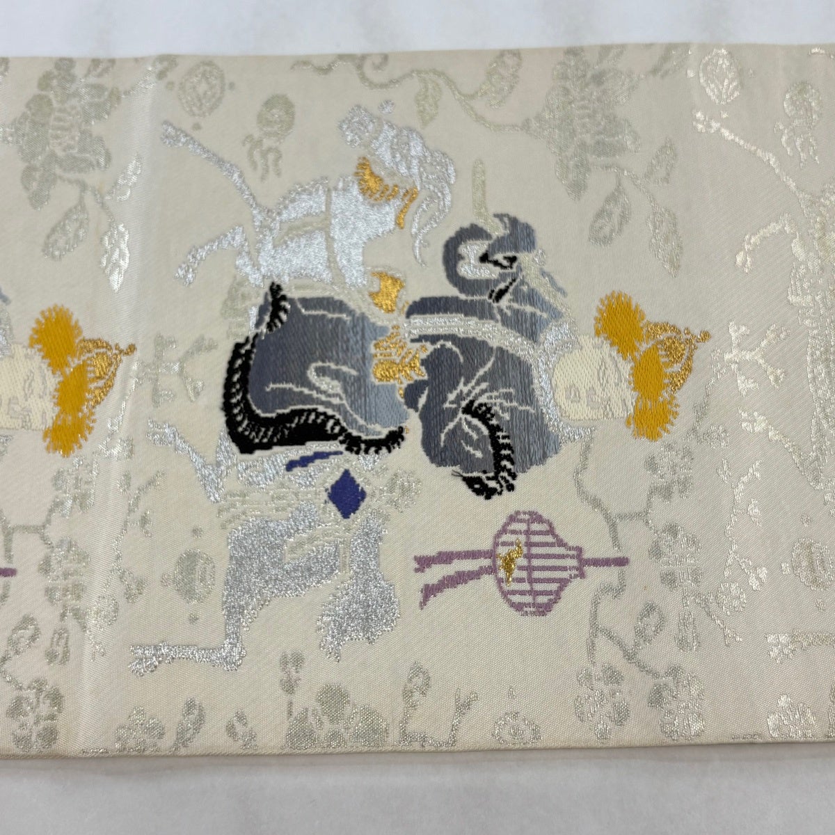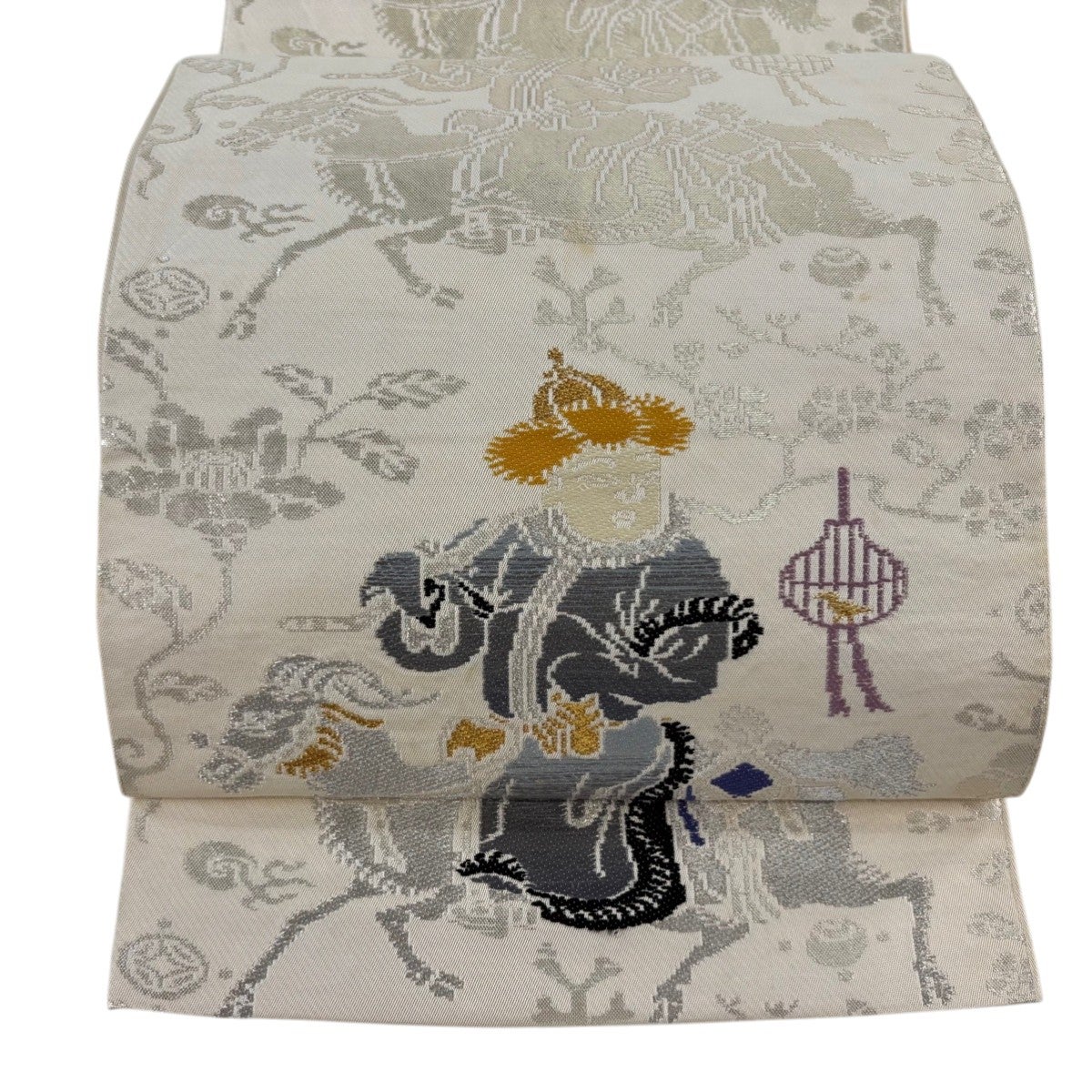 袋帯 秀品 落款あり 環美術織物 人物 動物 金銀糸 箔 クリーム 六通 正絹