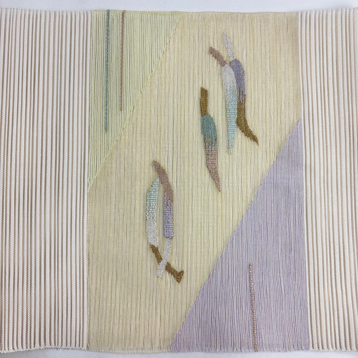 【美品】 名古屋帯 逸品 栗山吉三郎 落款あり 鳥 花籠 縮緬 クリーム 正絹