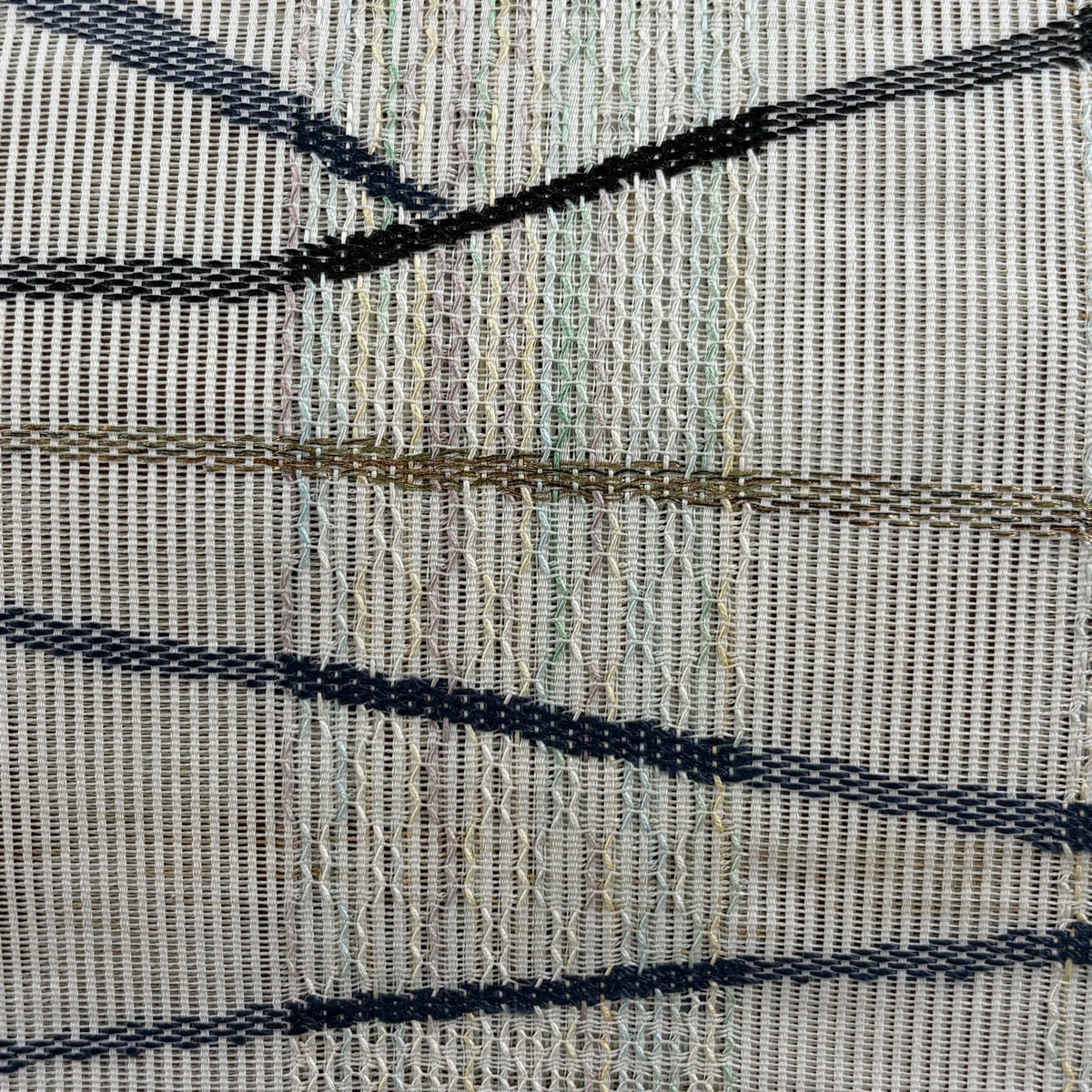 名古屋帯 秀品 夏帯 絽 八寸名古屋帯 よろけ縞 幾何学模様 金銀糸 クリーム 正絹