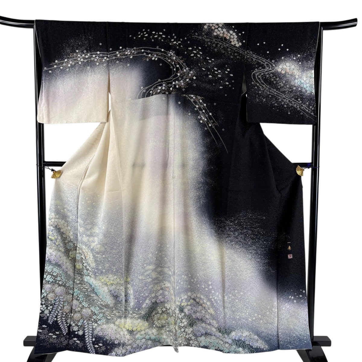 【美品】 振袖 身丈159cm 裄丈66cm M 袷 鈴乃屋 御所車 松竹梅 金彩 ぼかし クリーム 正絹 秀品