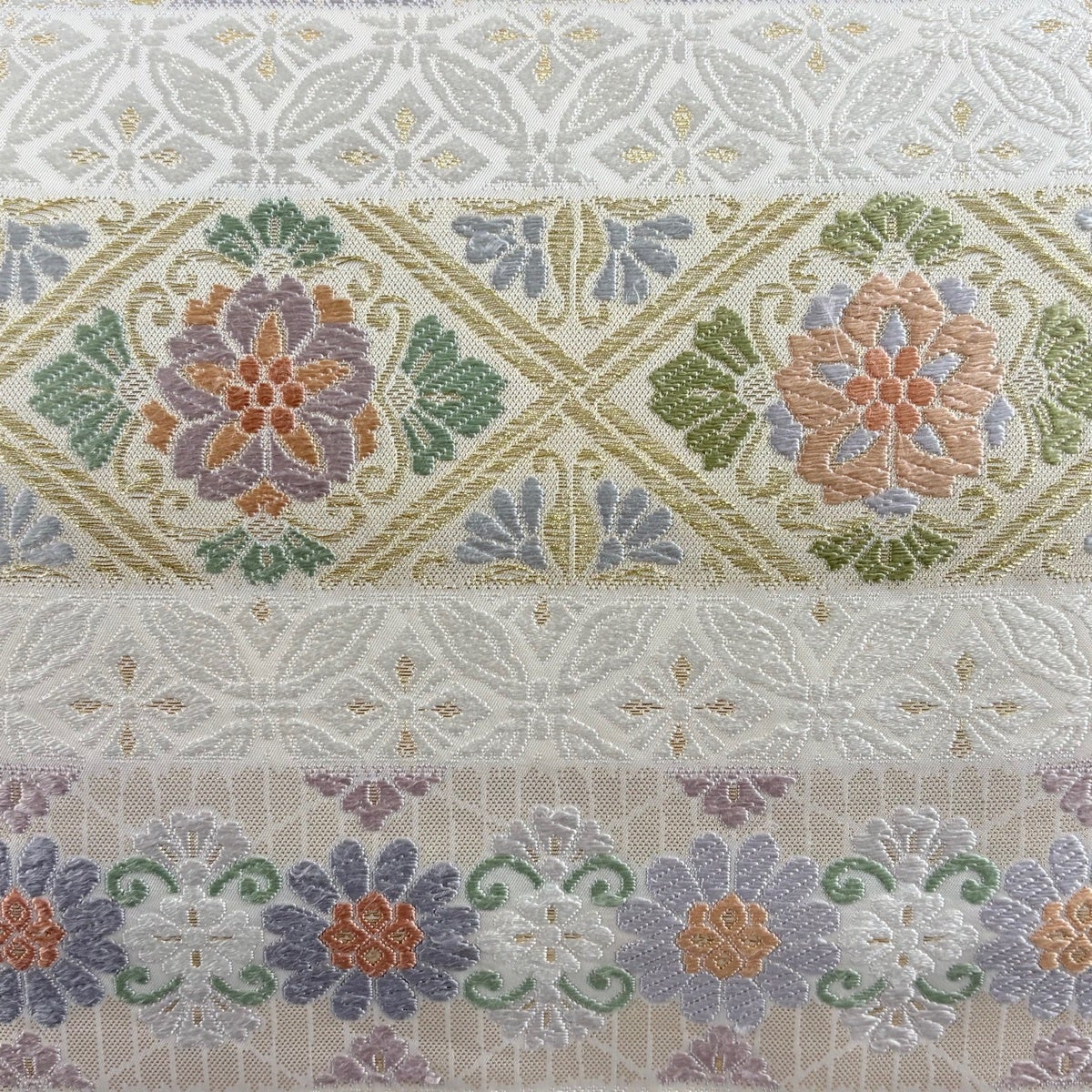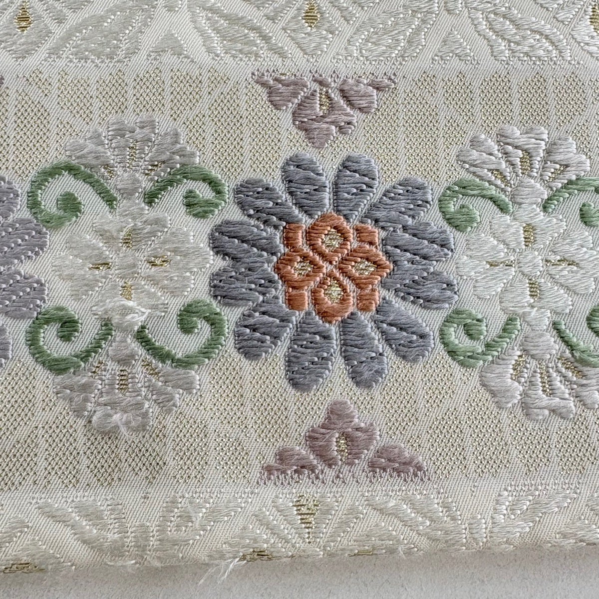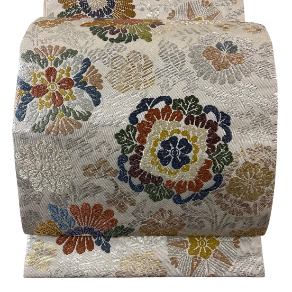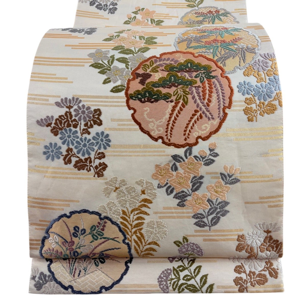 【在庫一掃】 袋帯 逸品 華文 草花 クリーム 全通 正絹