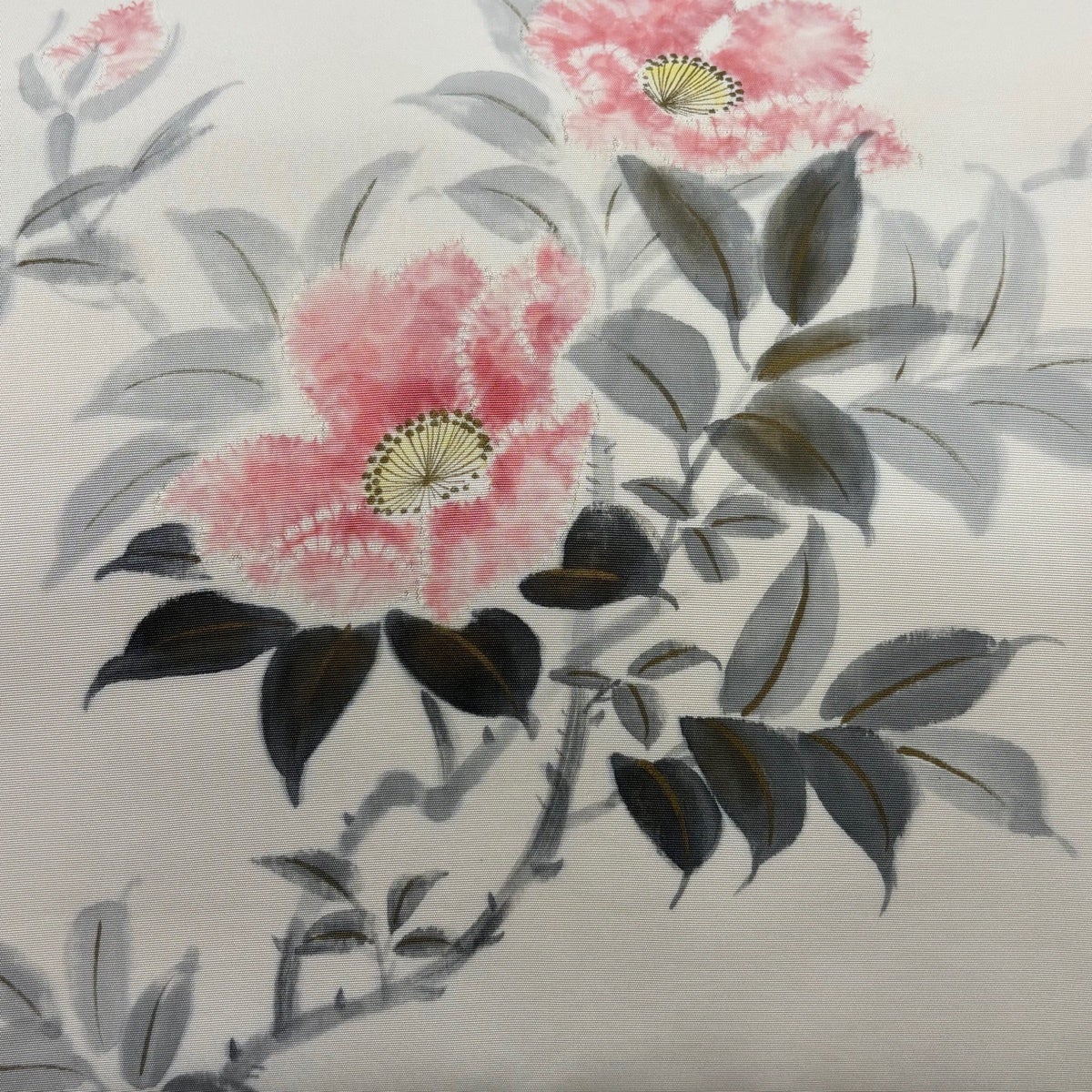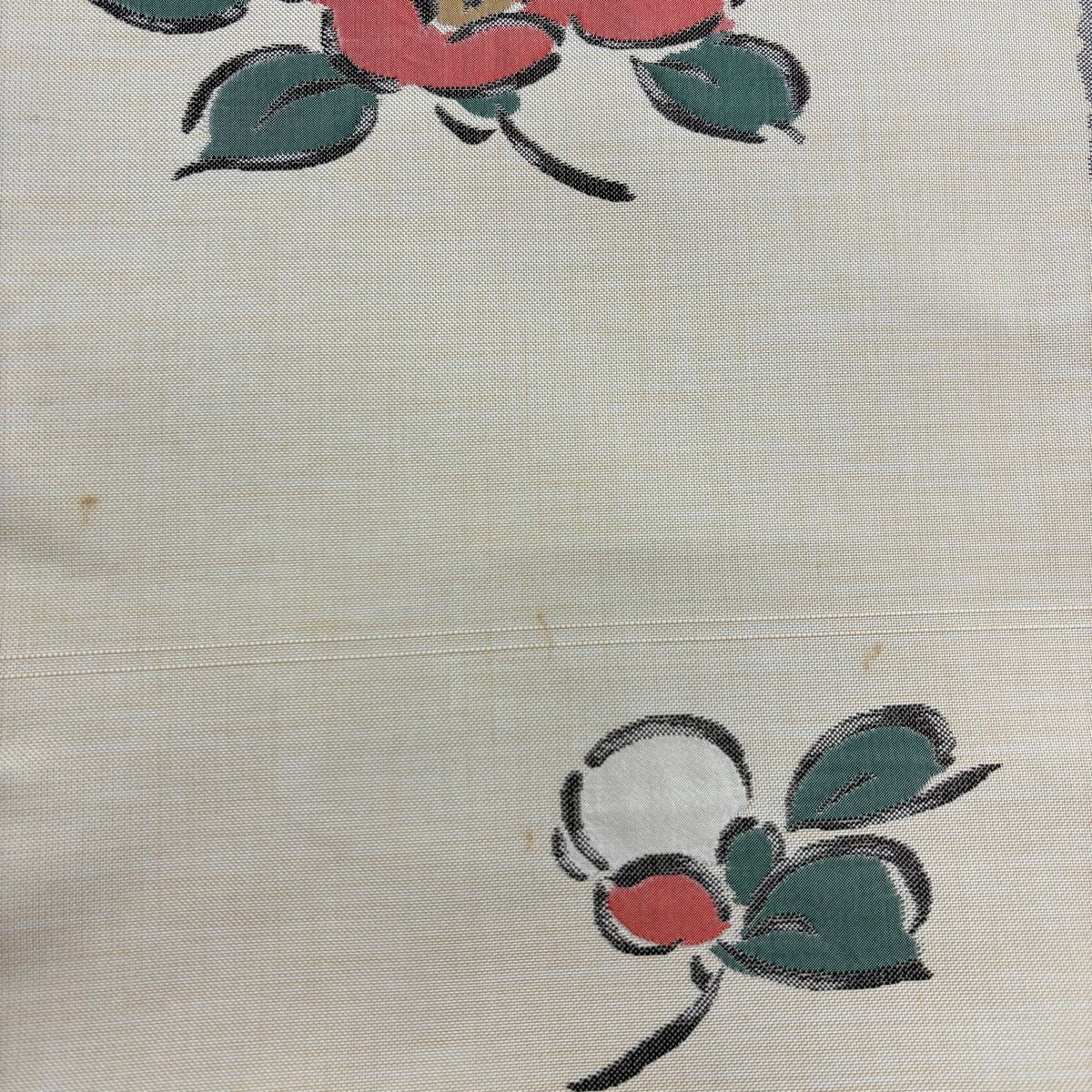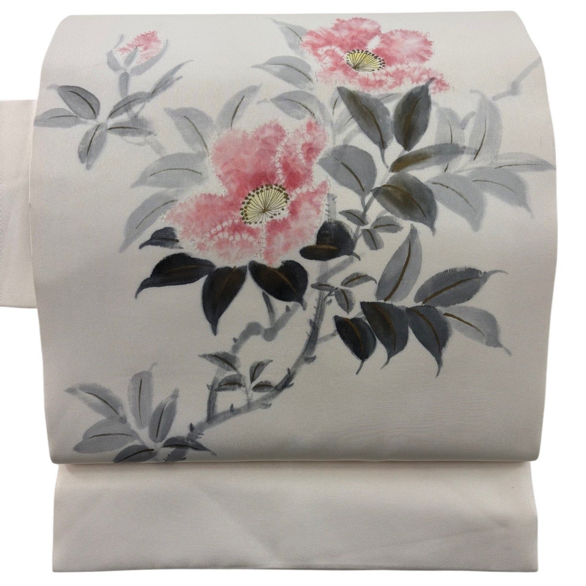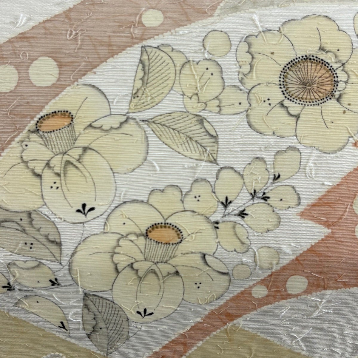 袋帯 秀品 落款あり 辻が花柄 椿 クリーム お太鼓柄 正絹
