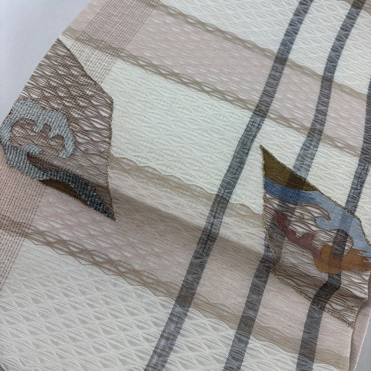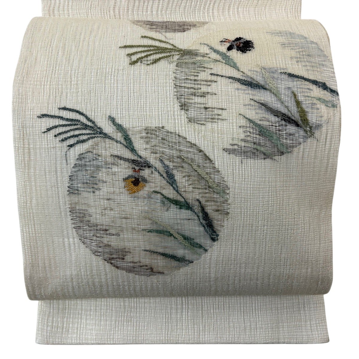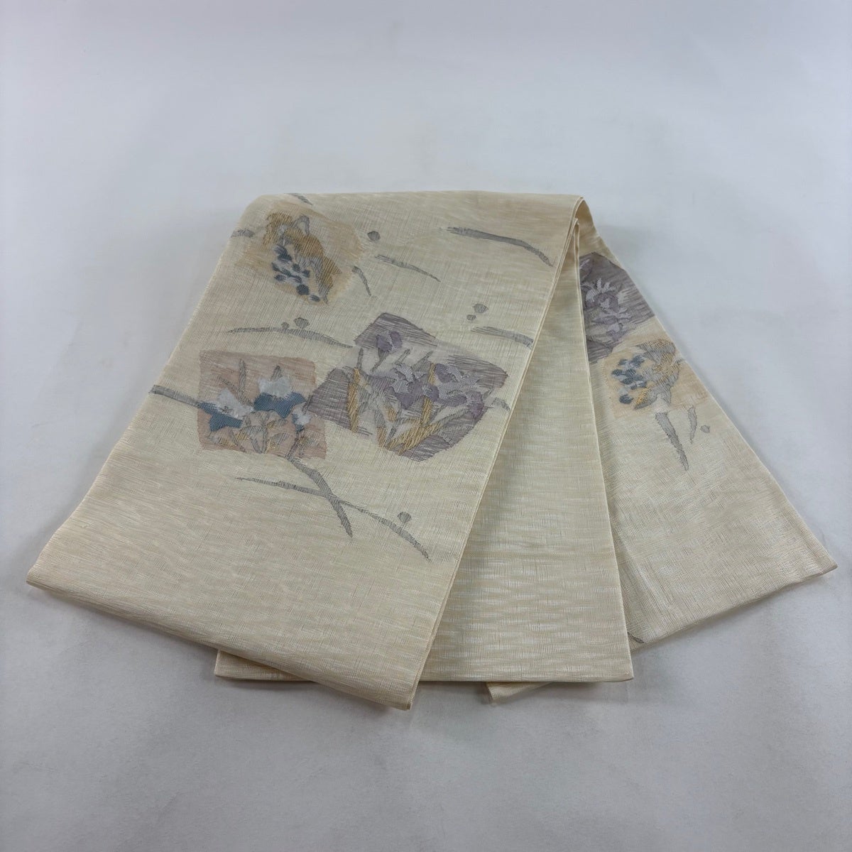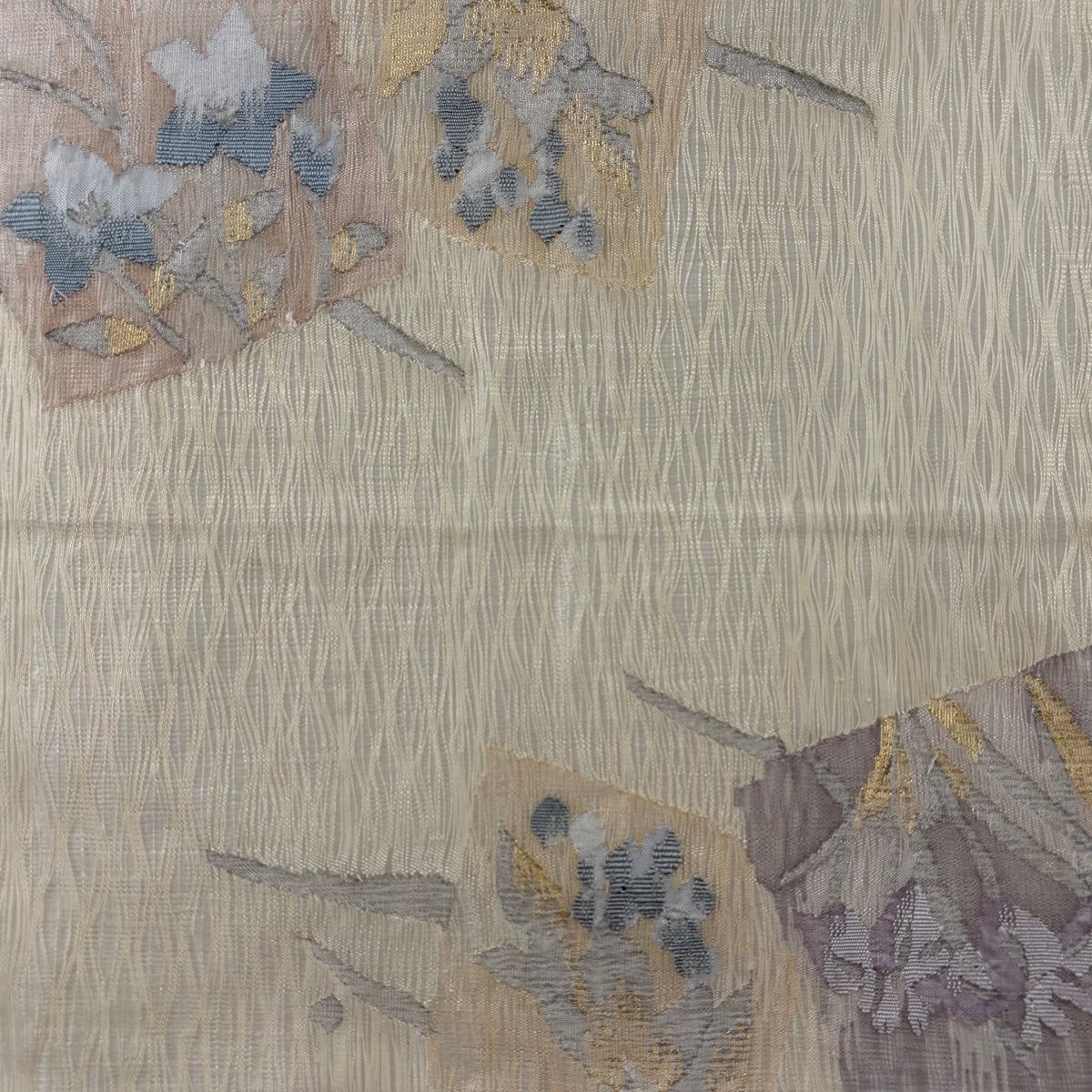 名古屋帯 秀品 夏帯 絽 草花 霞 刺繍 箔 クリーム 正絹