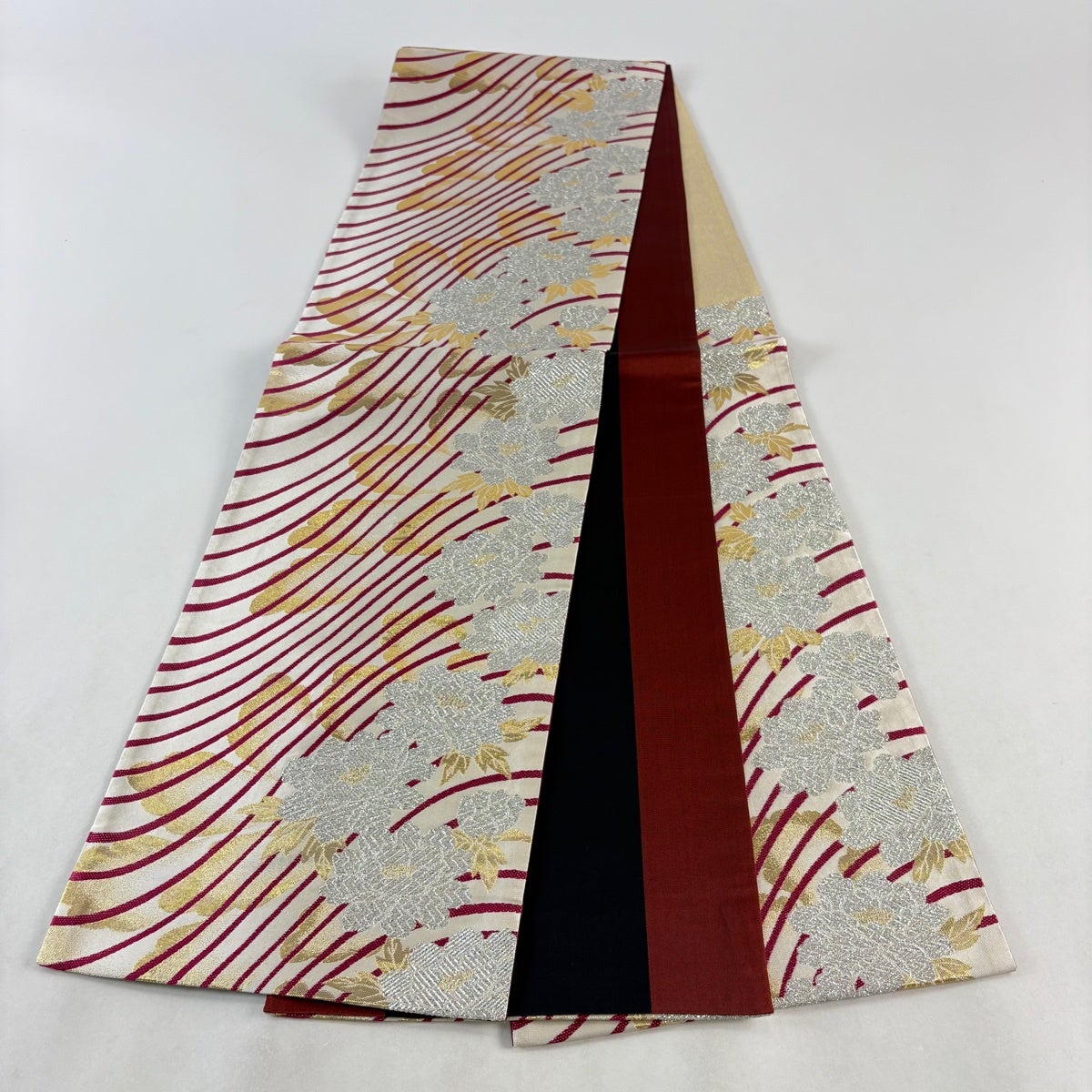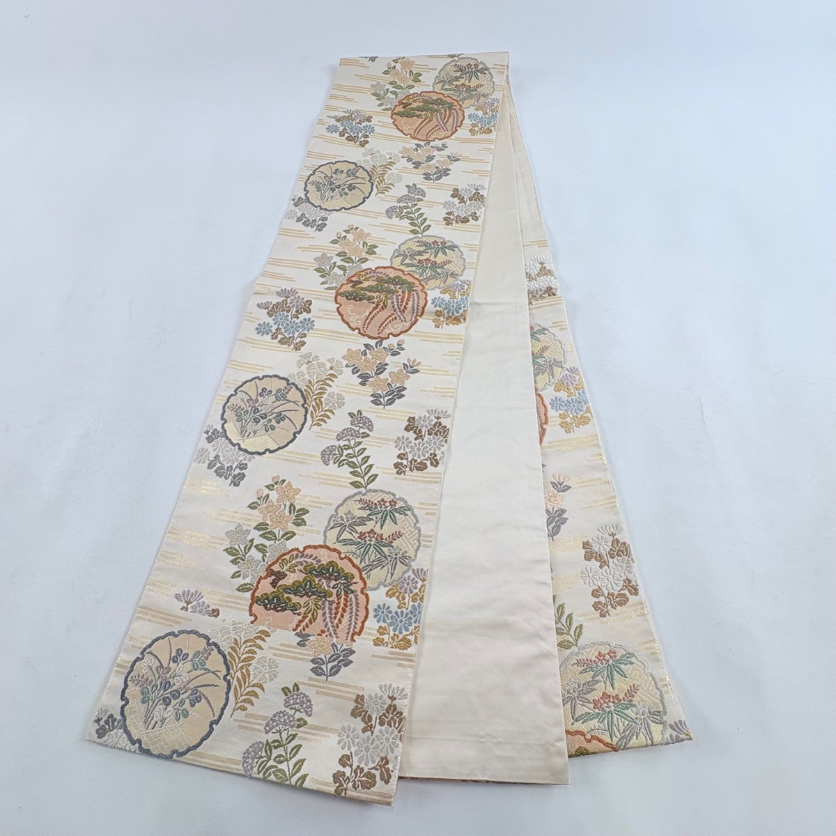 【美品】 袋帯 秀品 草花 流水 箔 クリーム 六通 正絹