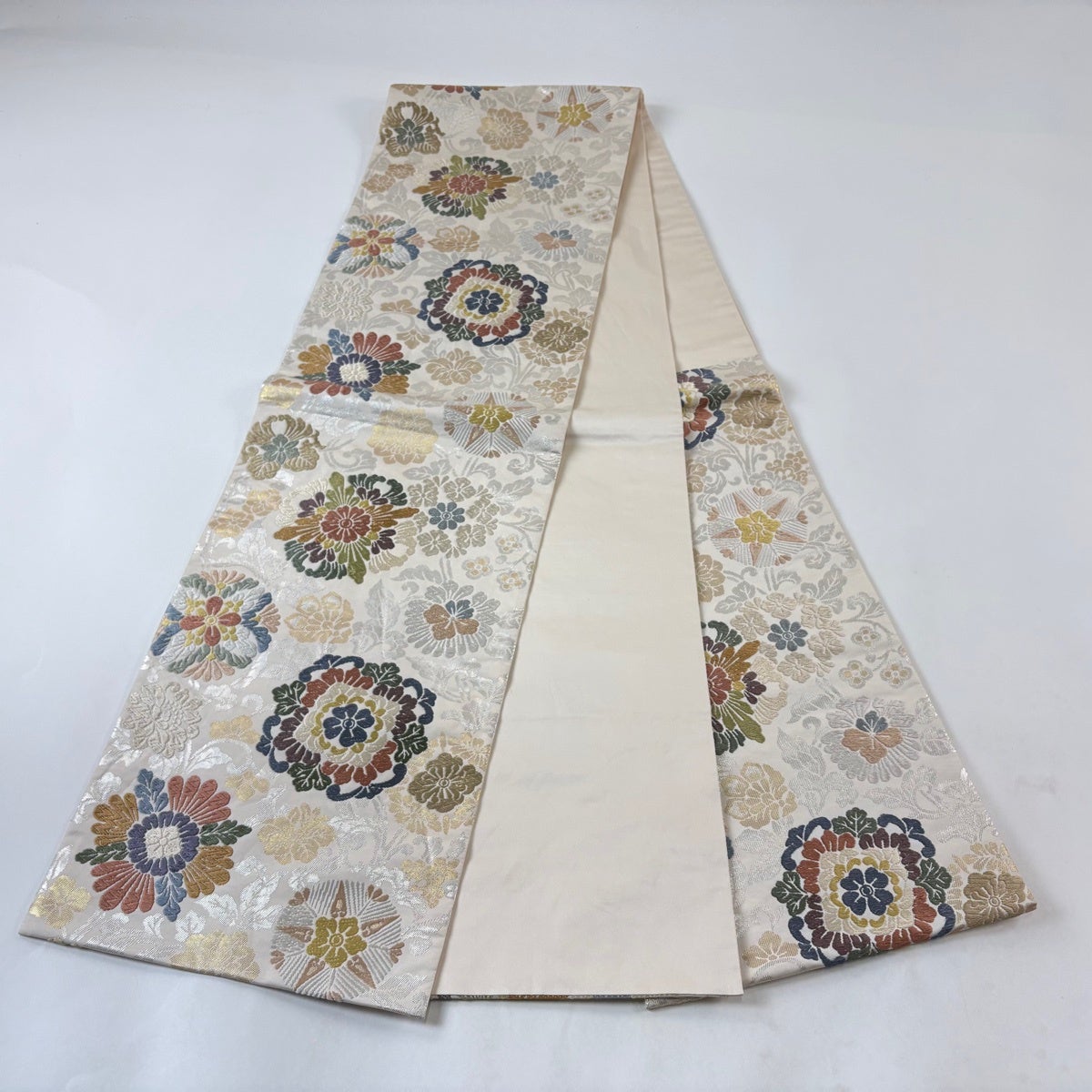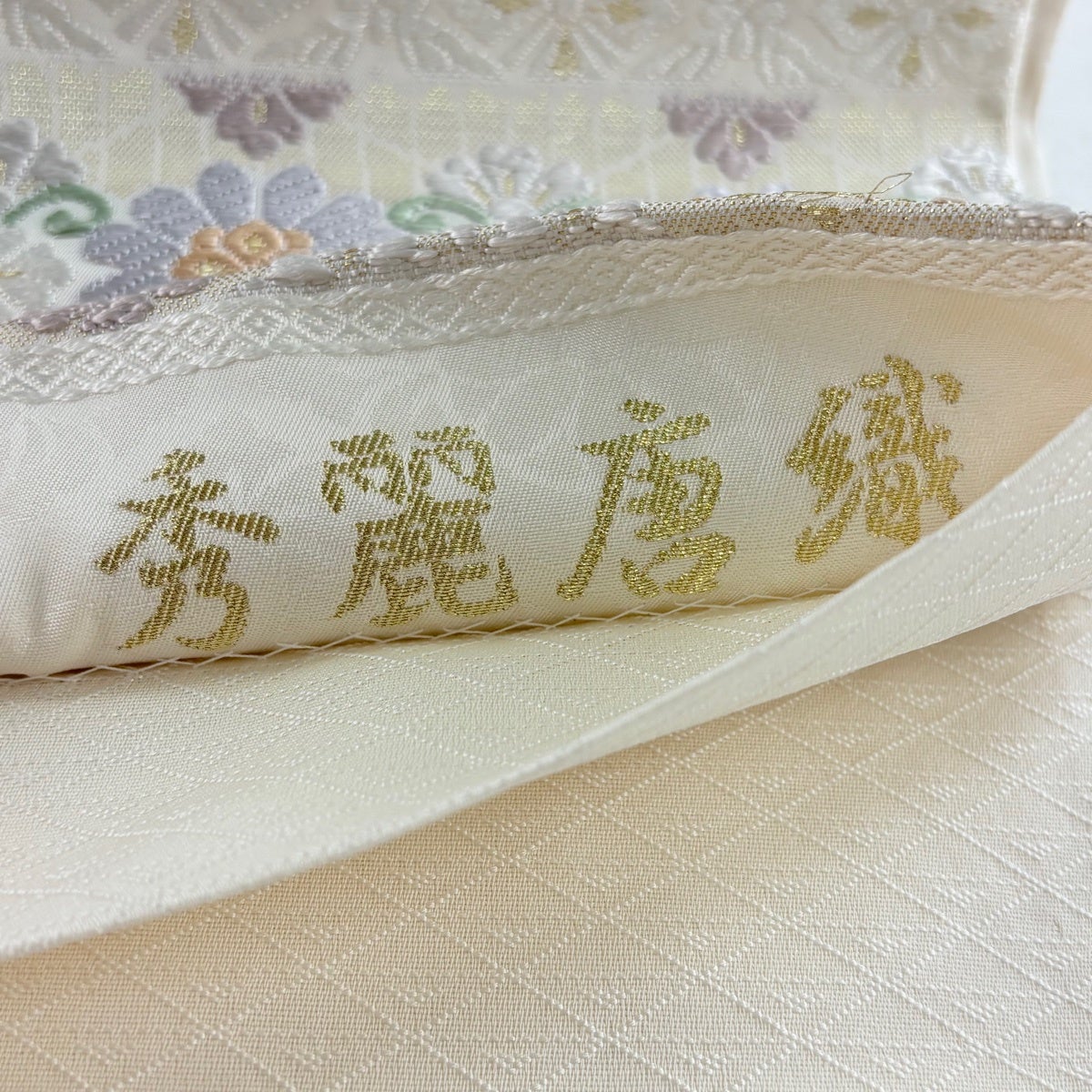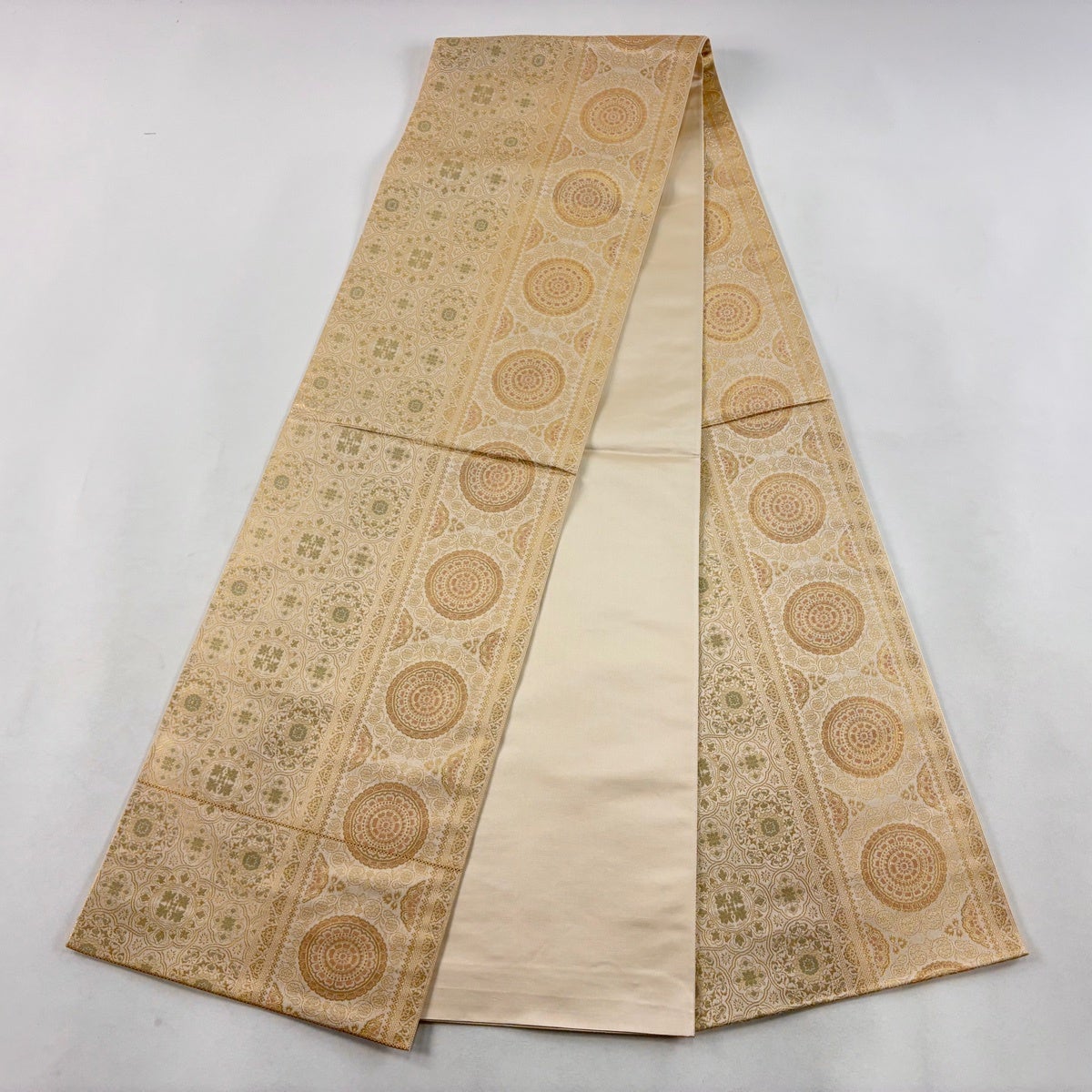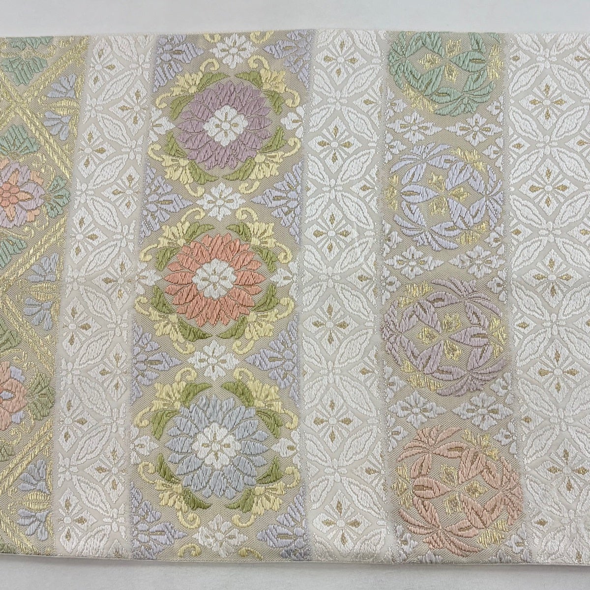 袋帯 名品 花 七宝花菱 金糸 唐織 クリーム 六通 正絹