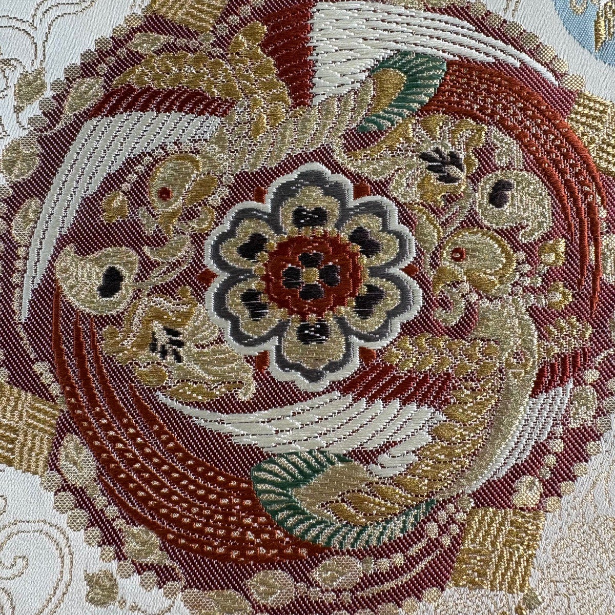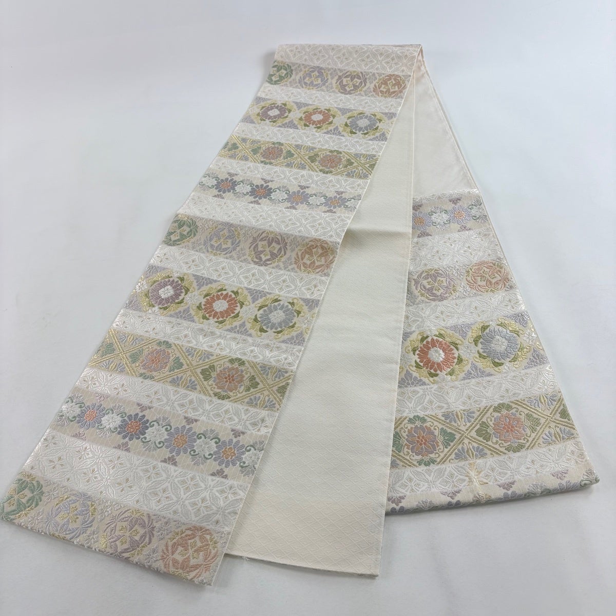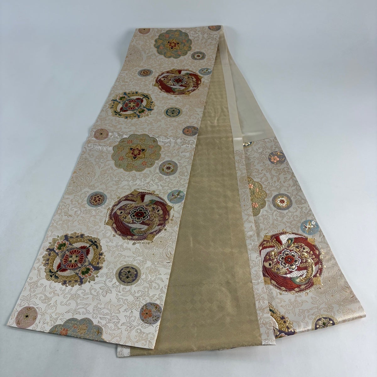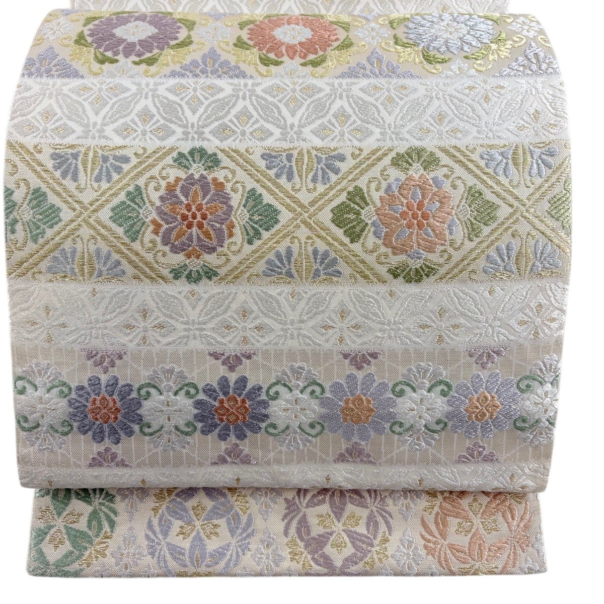 袋帯 名品 花 七宝花菱 金糸 唐織 クリーム 六通 正絹