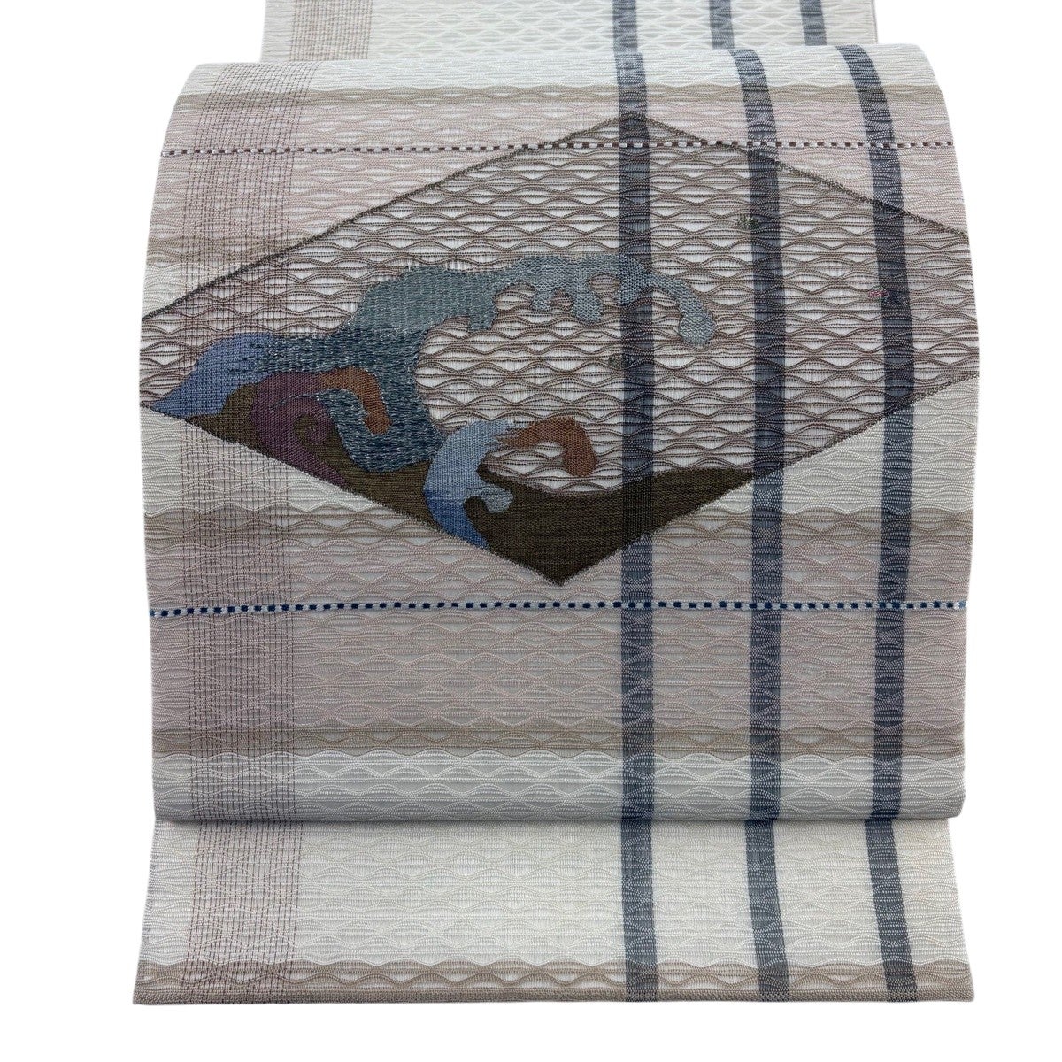 【美品】 名古屋帯 逸品 落款あり 紬地 蟹 クリーム 正絹