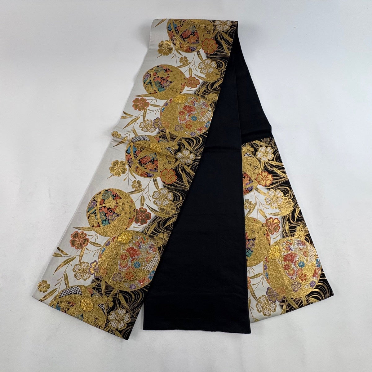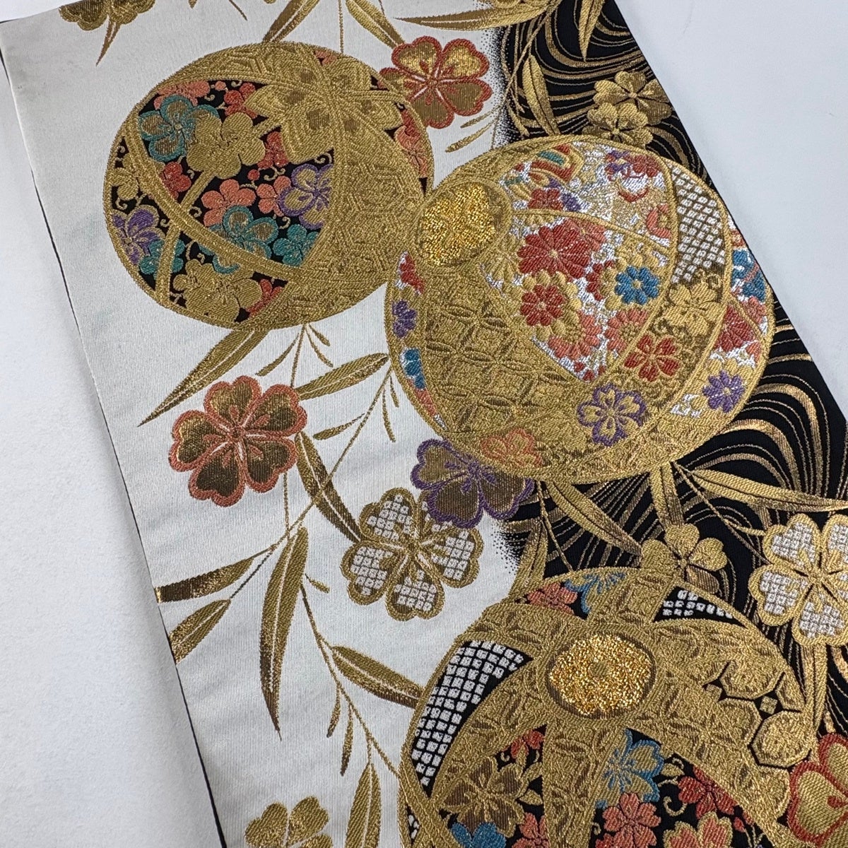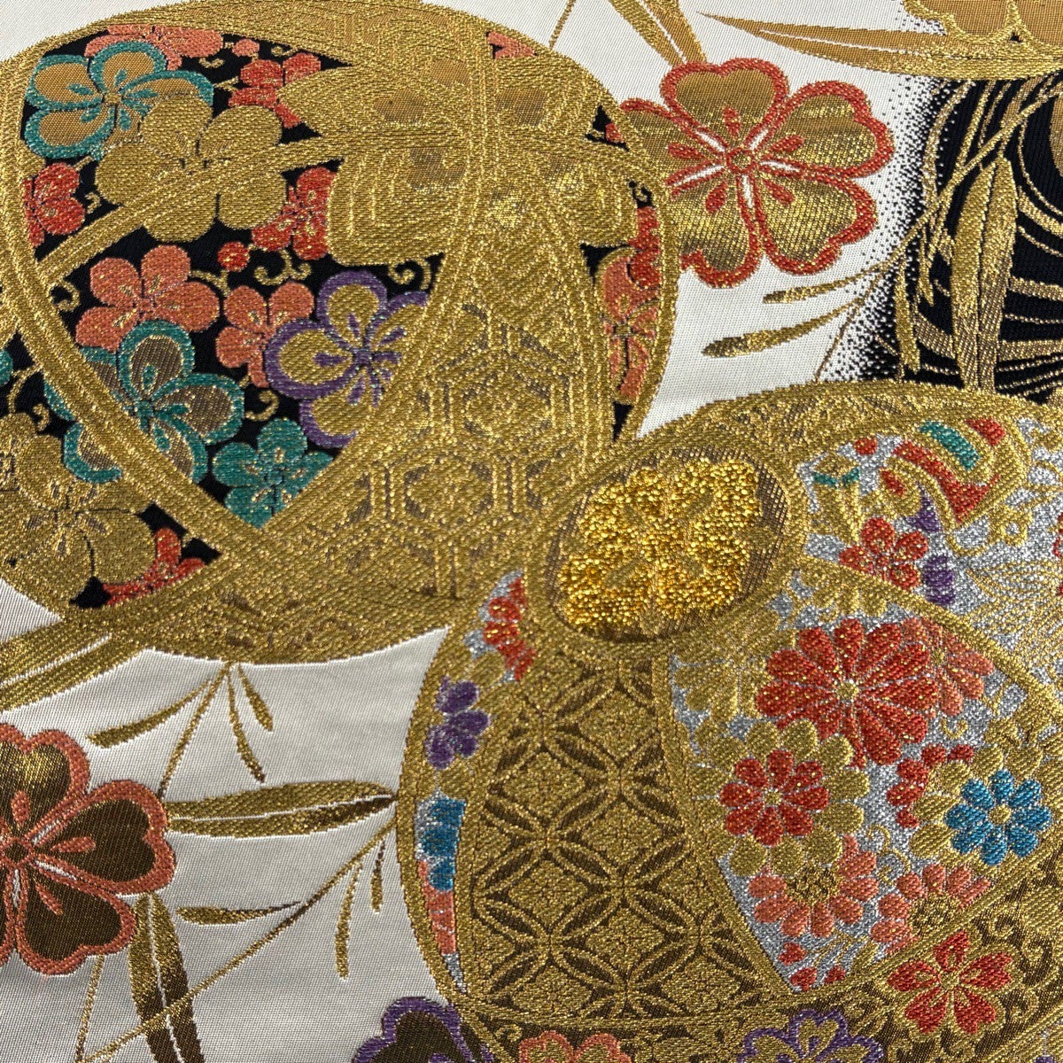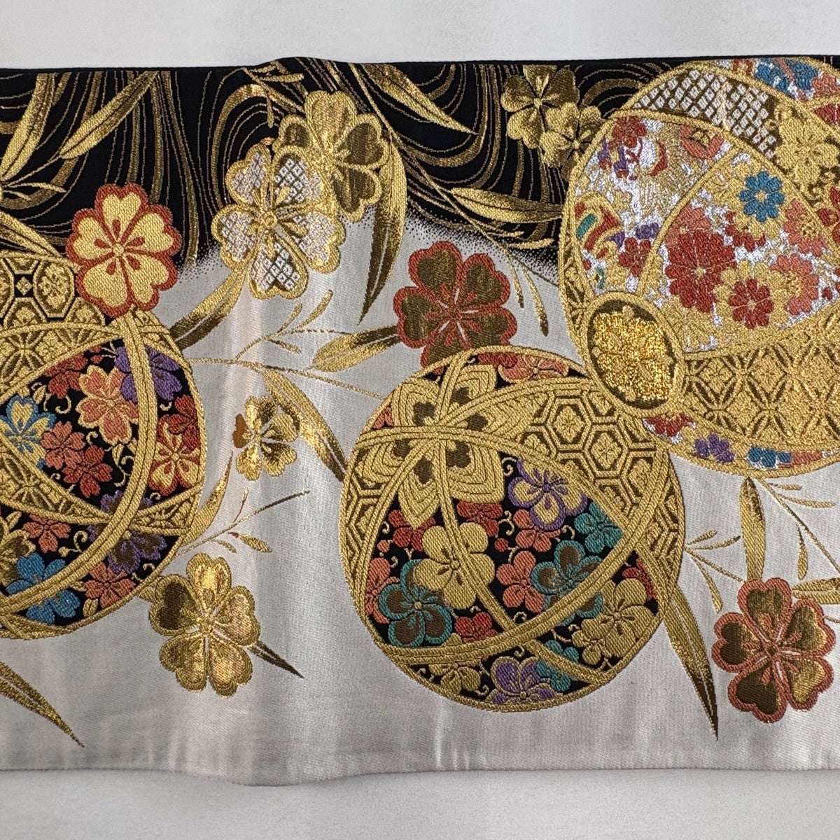 袋帯 秀品 落款あり 鞠 桜 金糸 箔 クリーム 六通 正絹