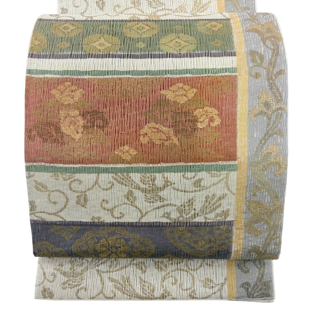 【美品】 袋帯 逸品 草花 金糸 箔 クリーム 六通 正絹