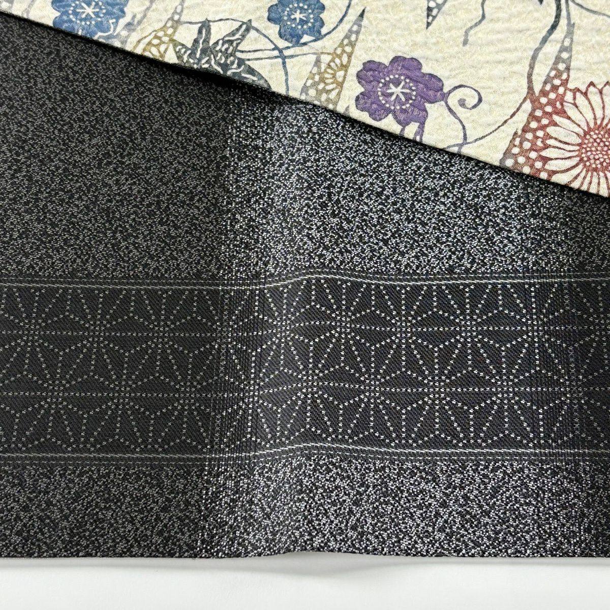 【美品】半幅帯 優品 幾何学模様 銀通し 箔 クリーム 化繊