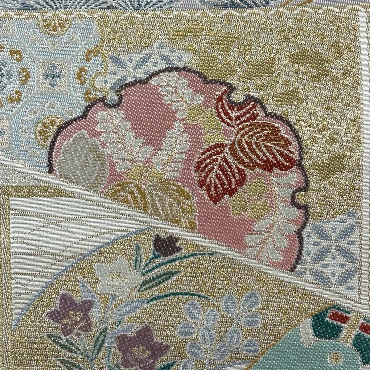 袋帯 秀品 落款あり 扇面 牡丹 金彩 クリーム お太鼓柄 正絹