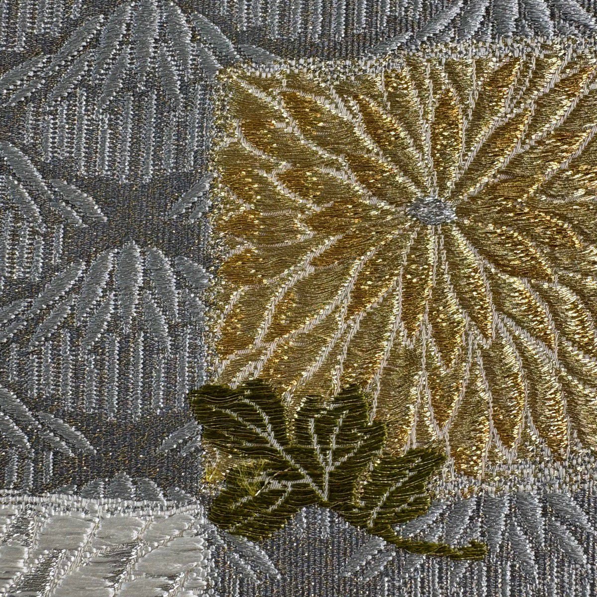 【美品】 袋帯 秀品 花丸文 菊 箔 唐織 クリーム 六通 正絹