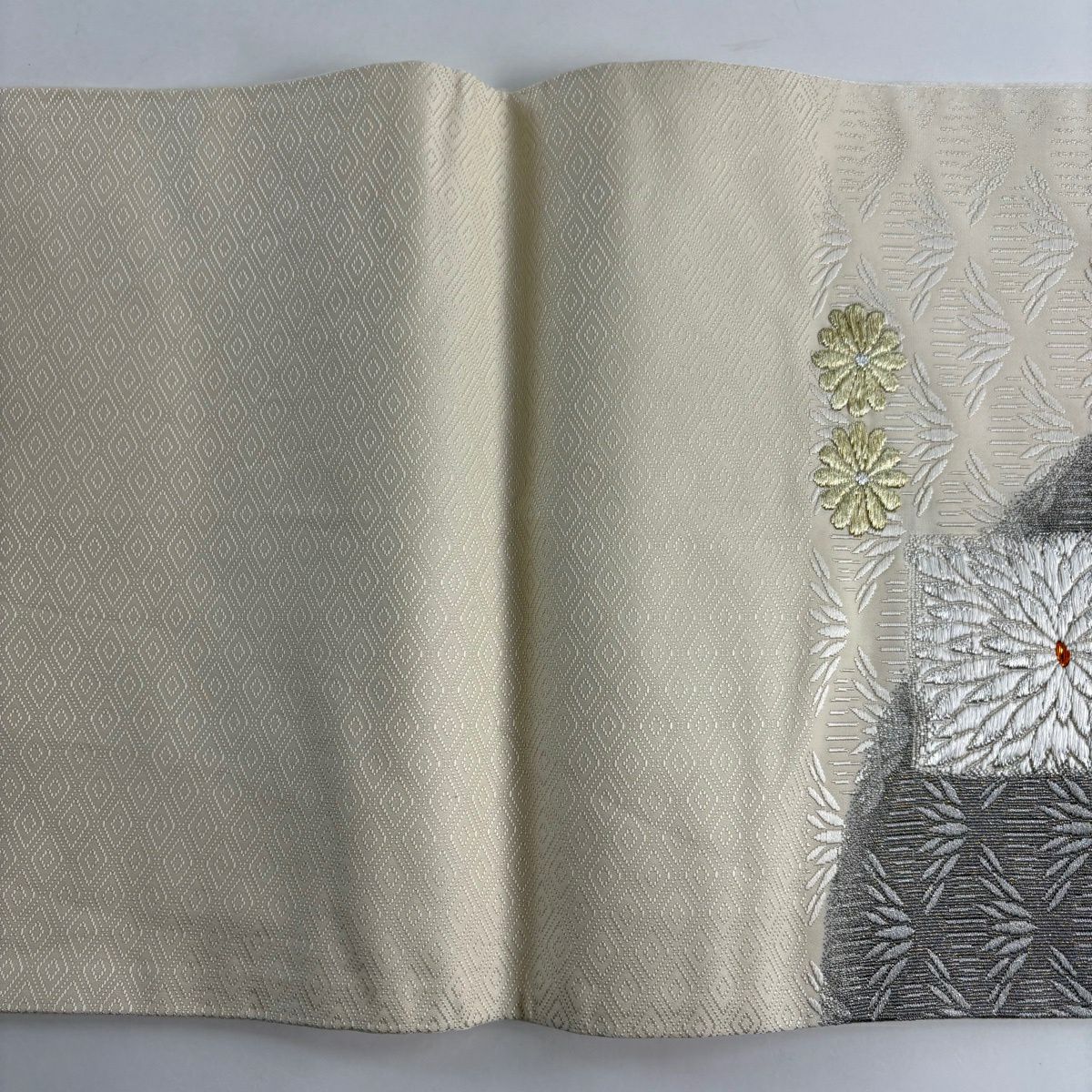 【美品】 袋帯 秀品 夏帯 幾何学 刺繍 クリーム お太鼓柄 正絹