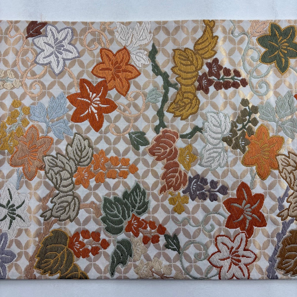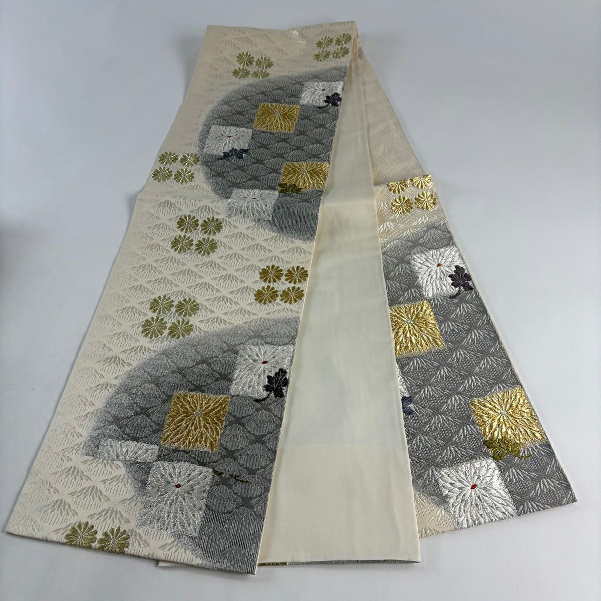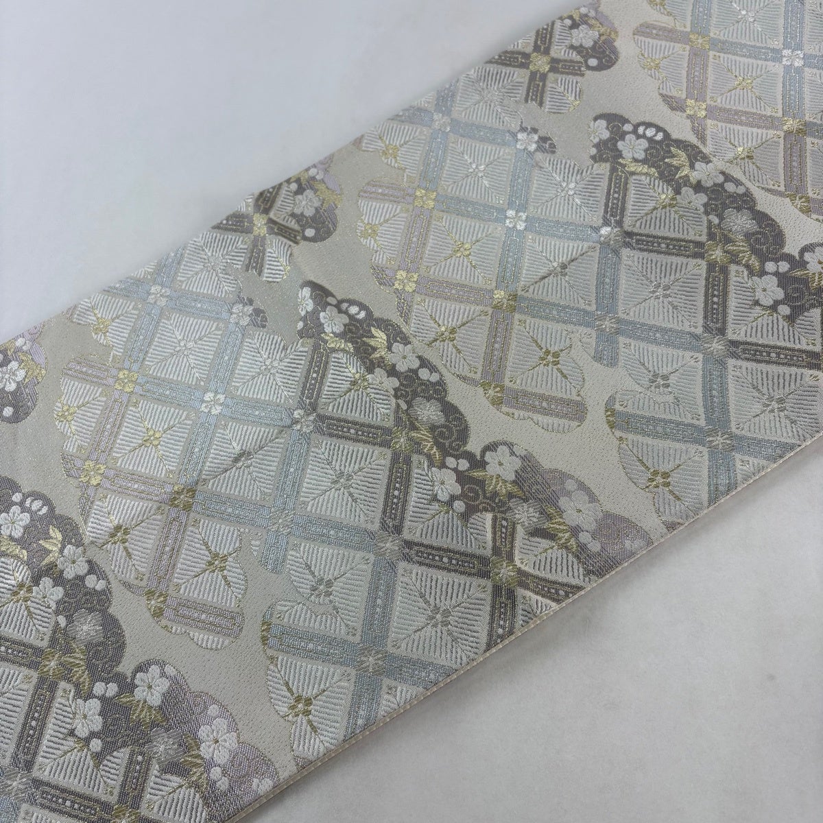 名古屋帯 逸品 喜多川平郎 花丸文 桧垣文 刺繍 クリーム 正絹