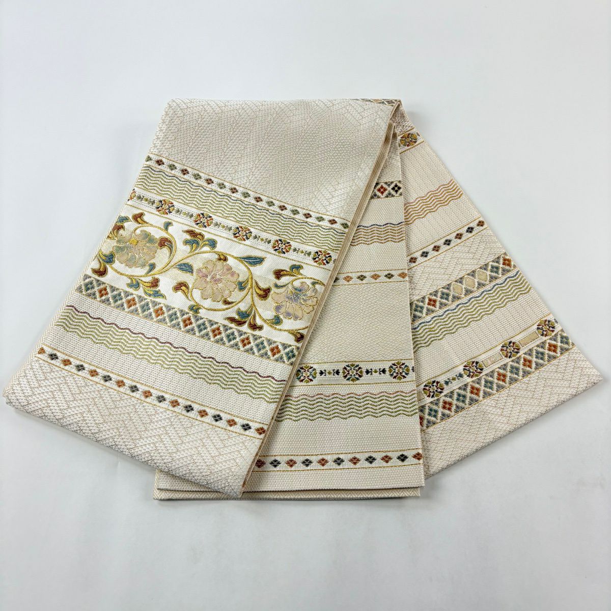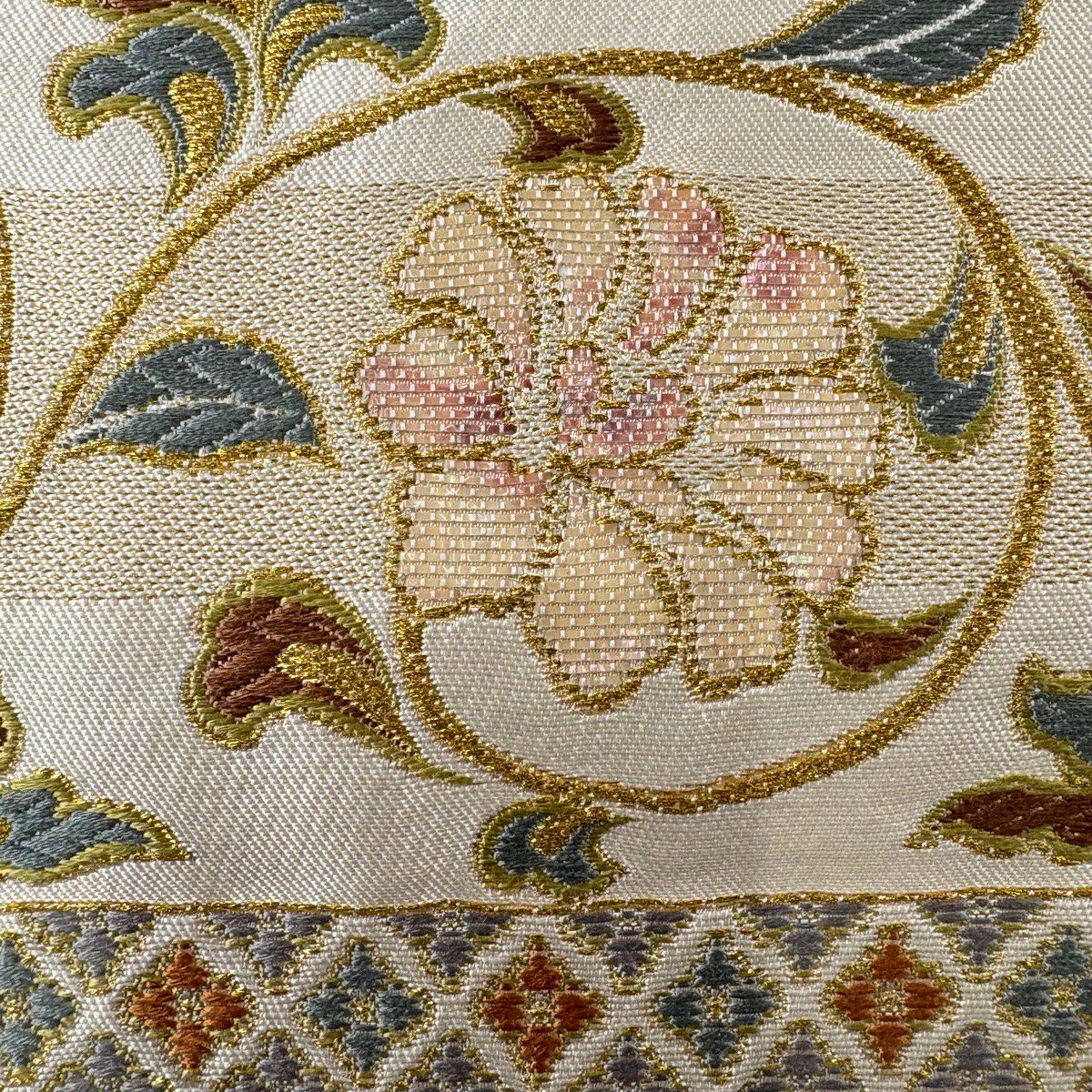 【美品】 袋帯 秀品 華文 草花 唐織 箔 クリーム 六通 正絹