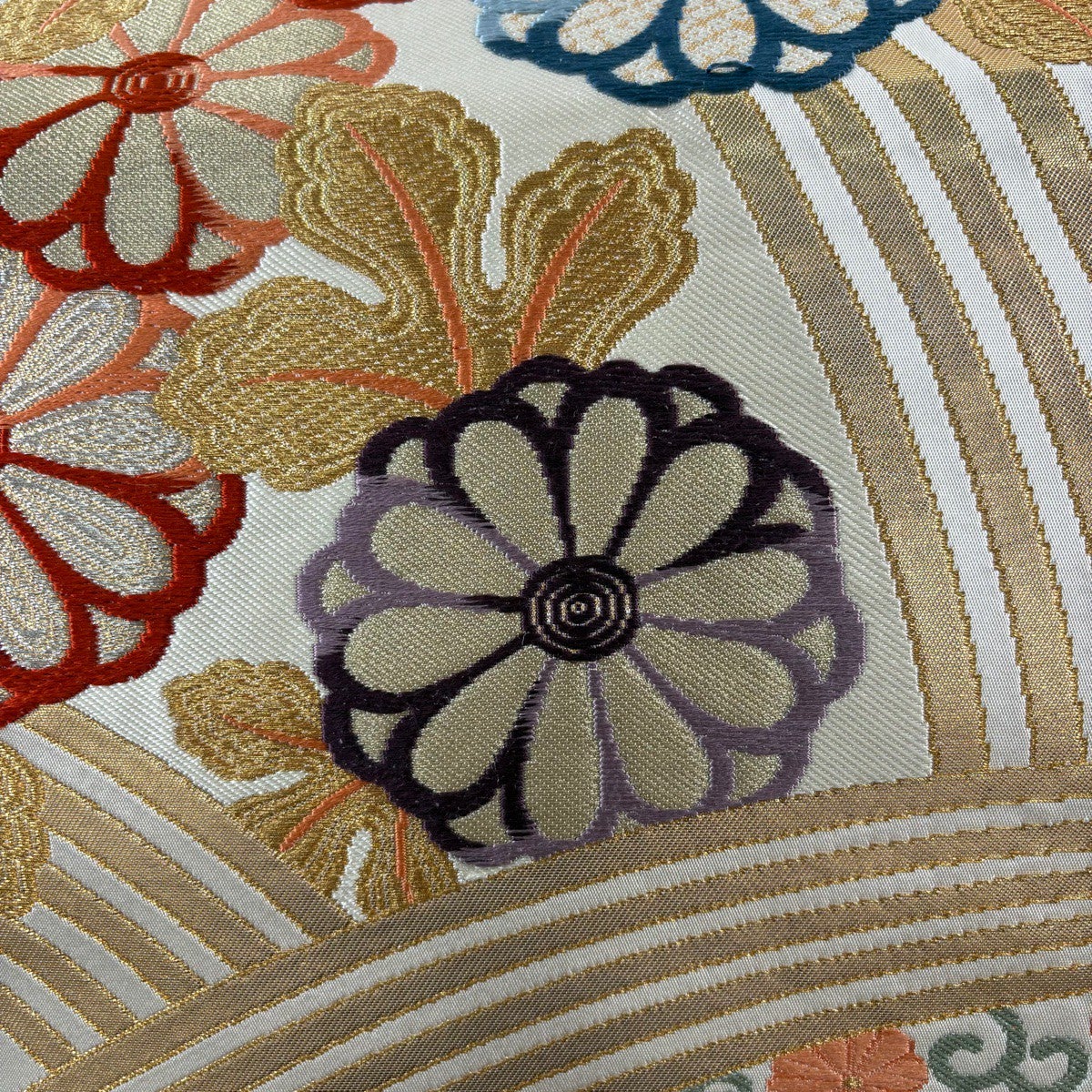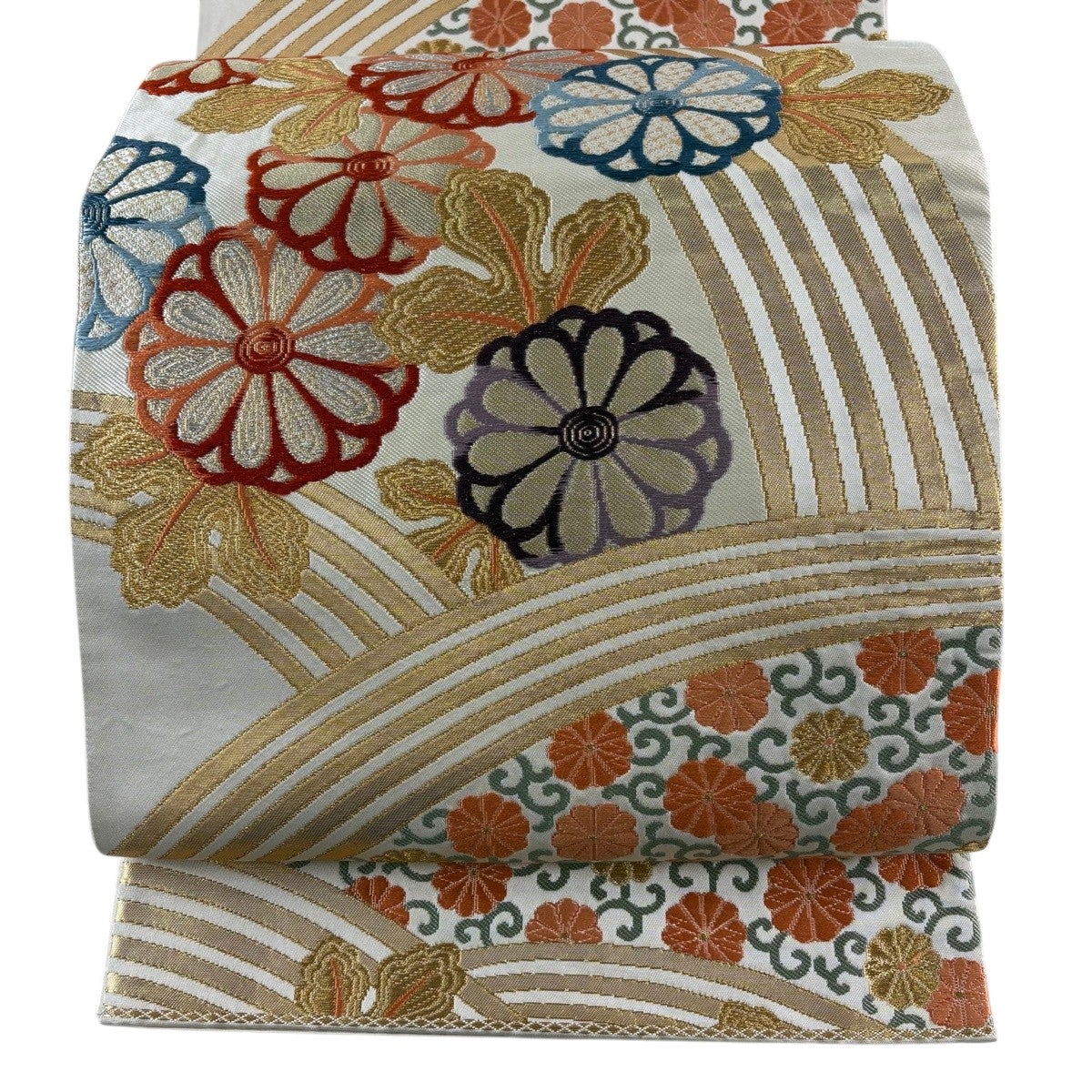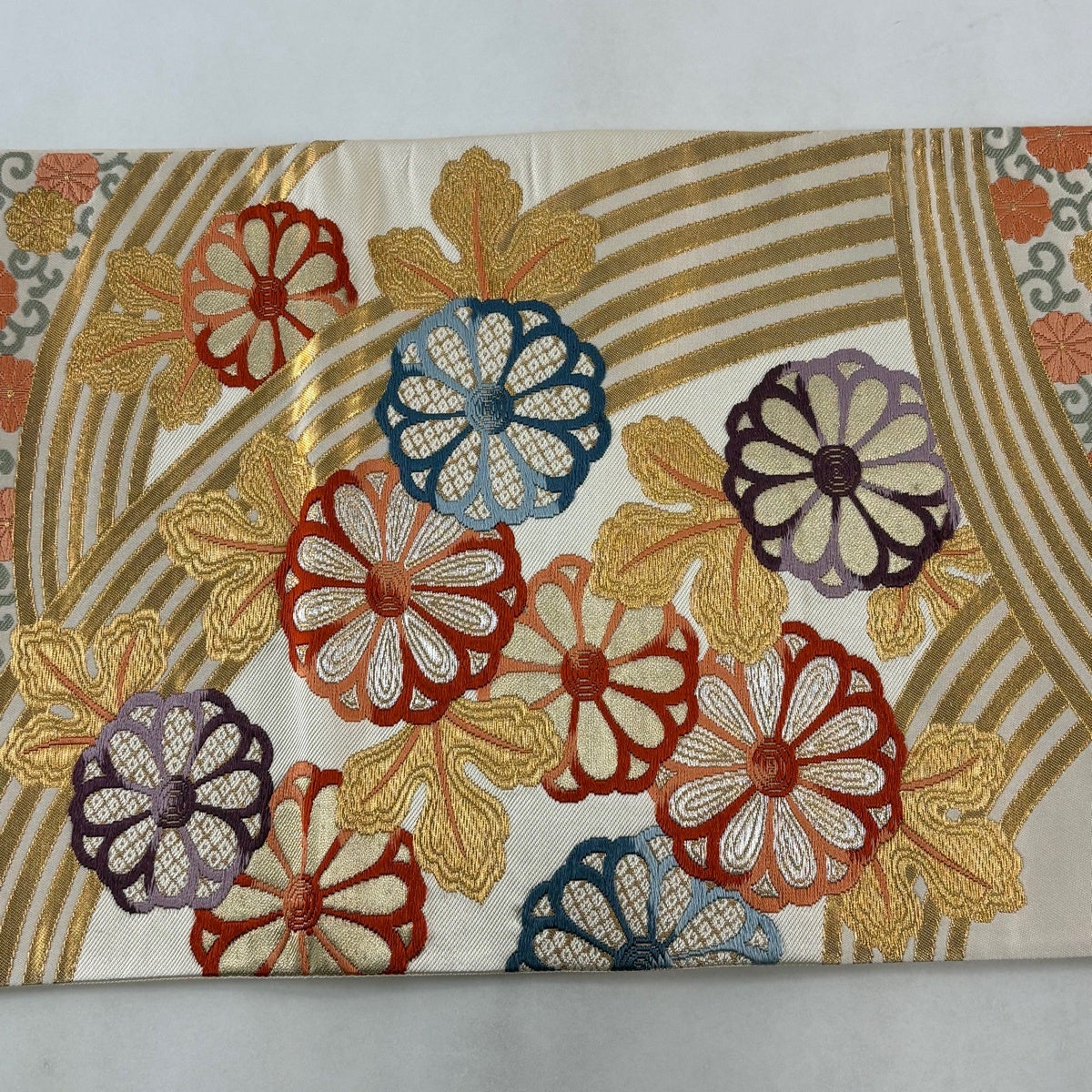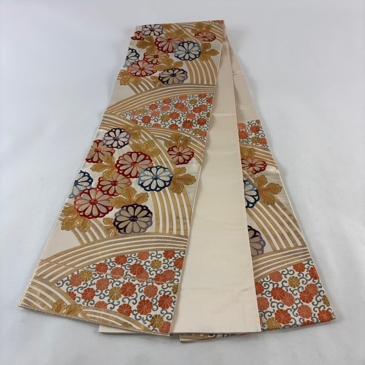 袋帯 秀品 関西仕立て 菊 華文 金銀糸 刺繍 クリーム 六通 正絹