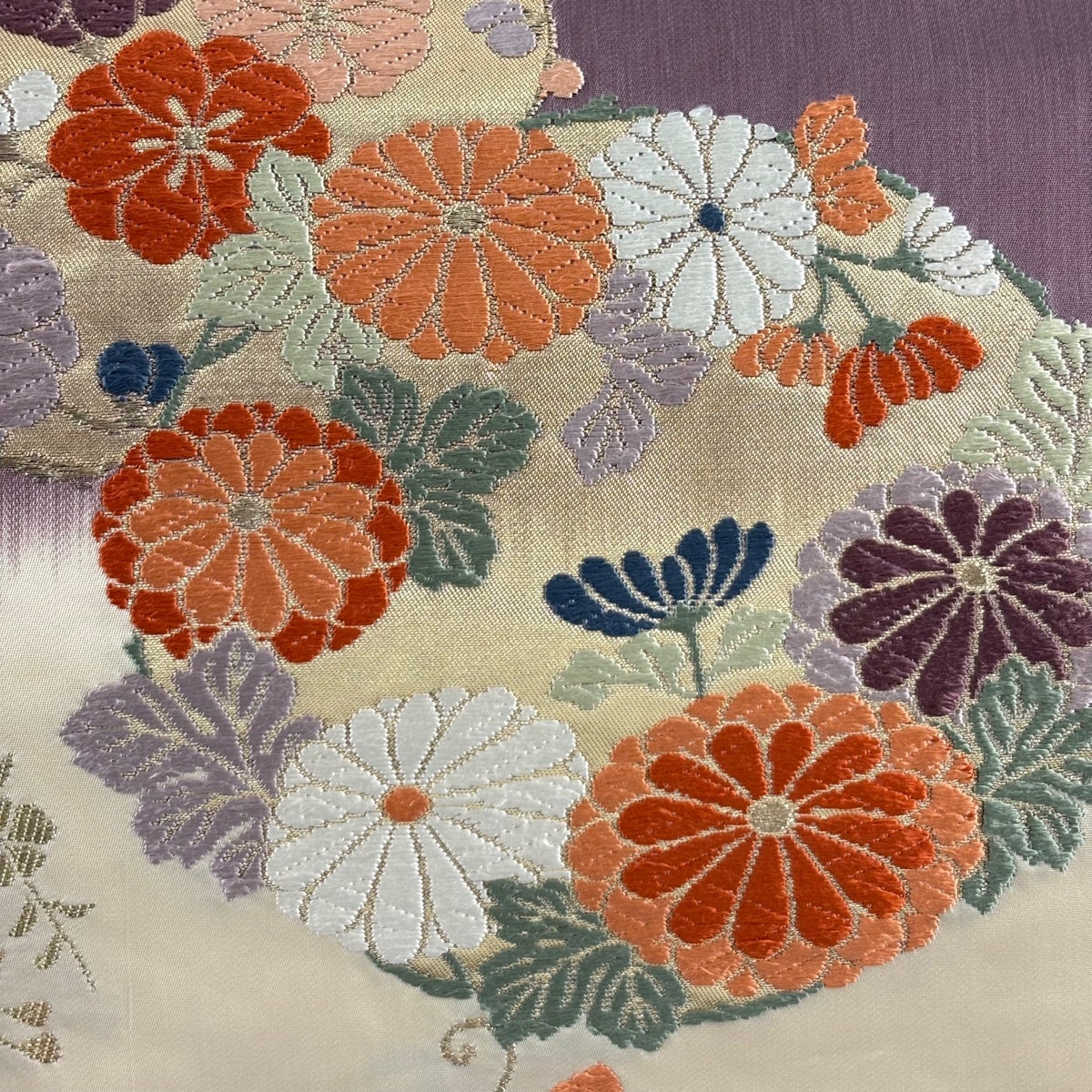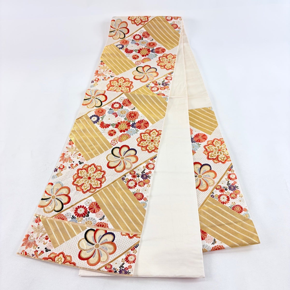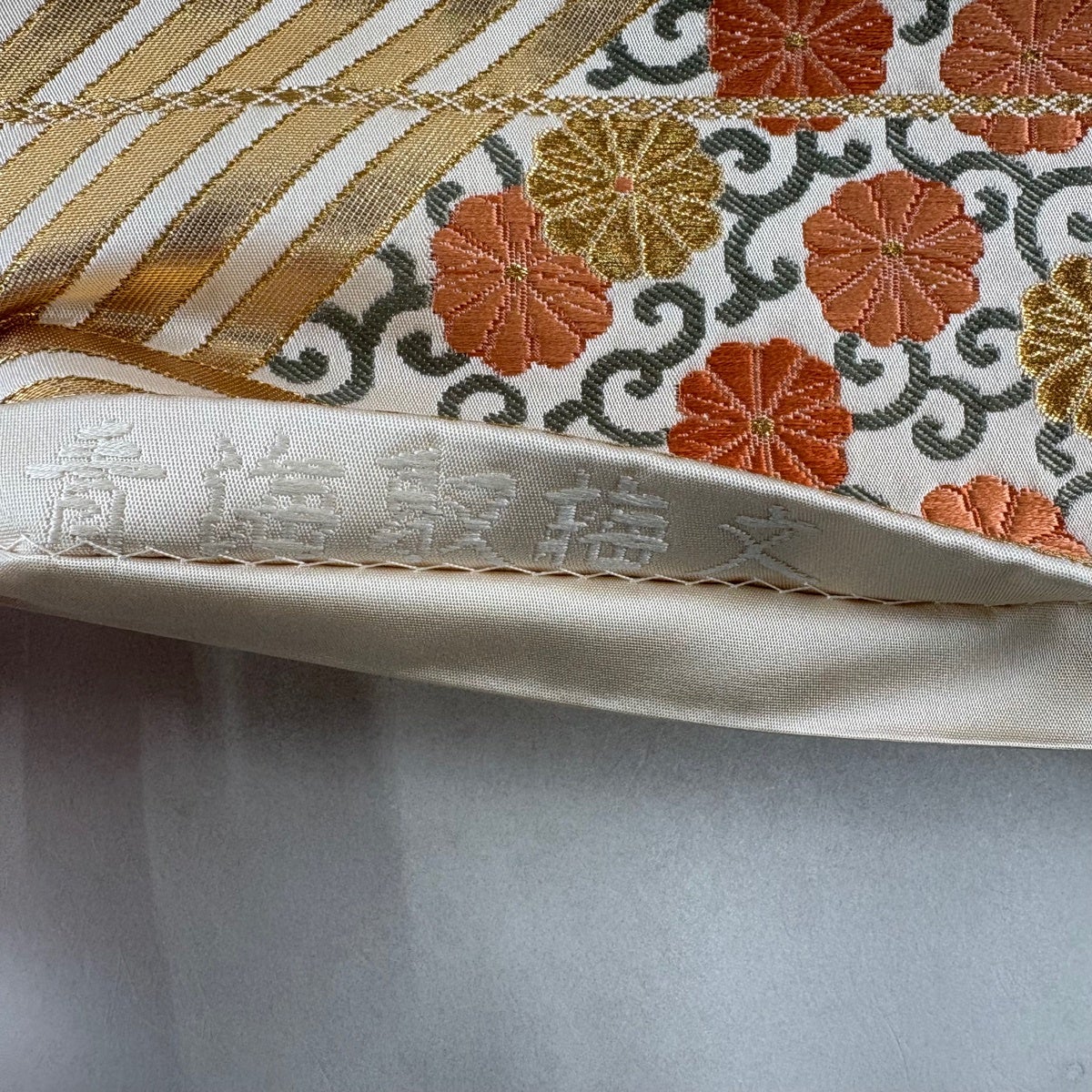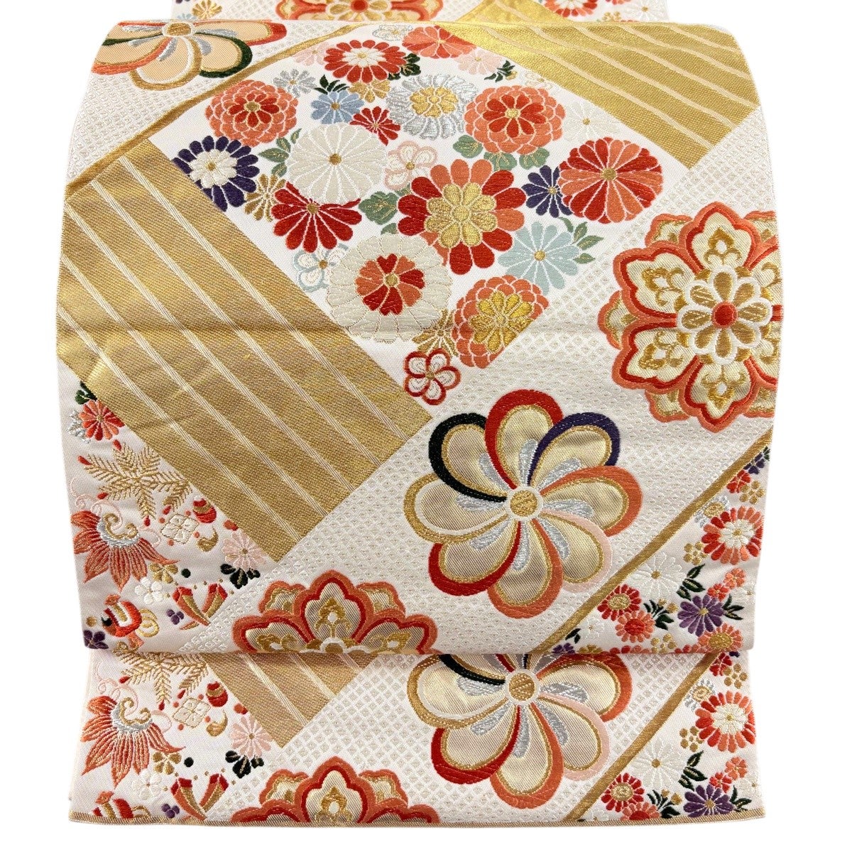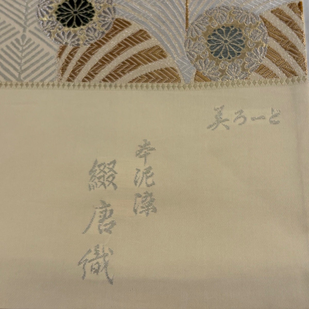 袋帯 秀品 関西仕立て 菊 華文 金銀糸 刺繍 クリーム 六通 正絹