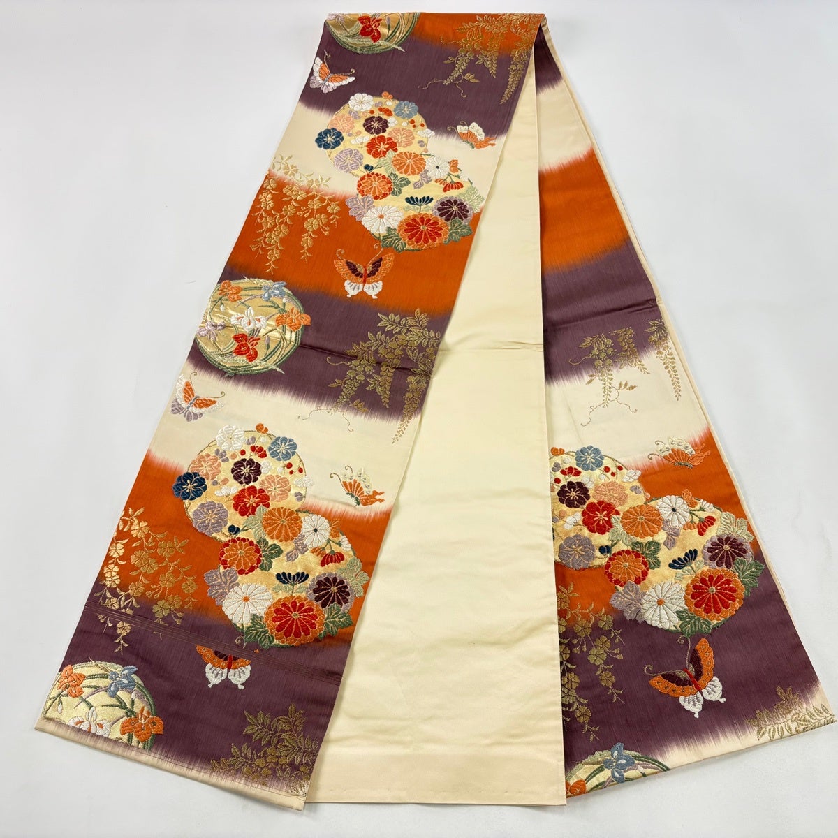 袋帯 秀品 関西仕立て 花丸文 蝶 金糸 唐織 クリーム 六通 正絹