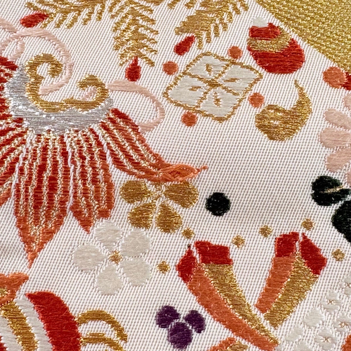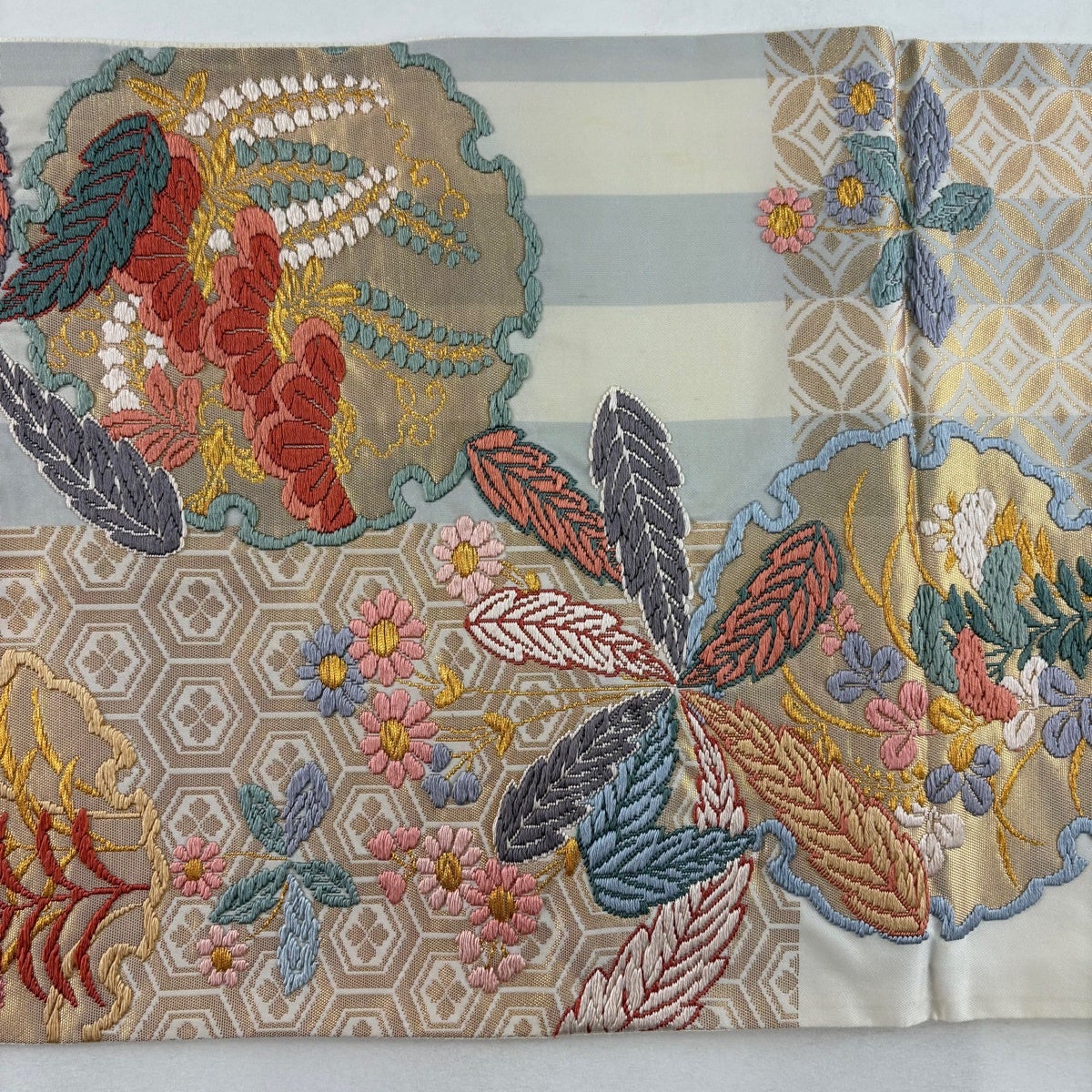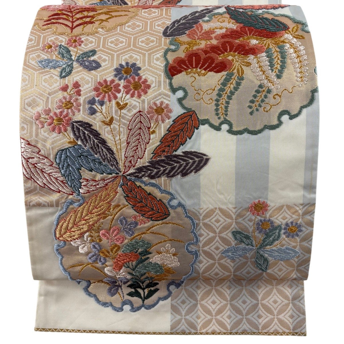 【美品】 袋帯 名品 扇 草花 刺繍 螺鈿 クリーム お太鼓柄 正絹