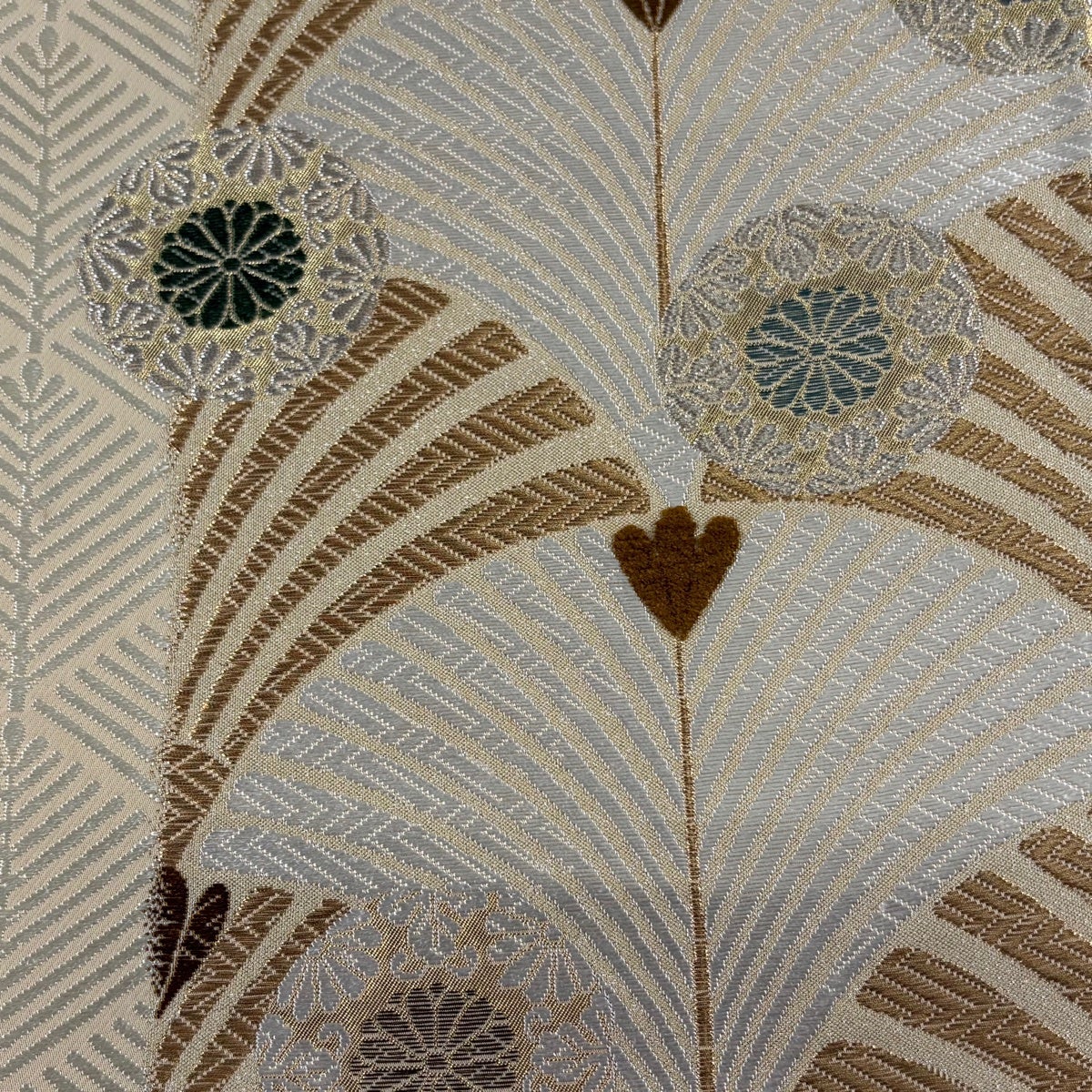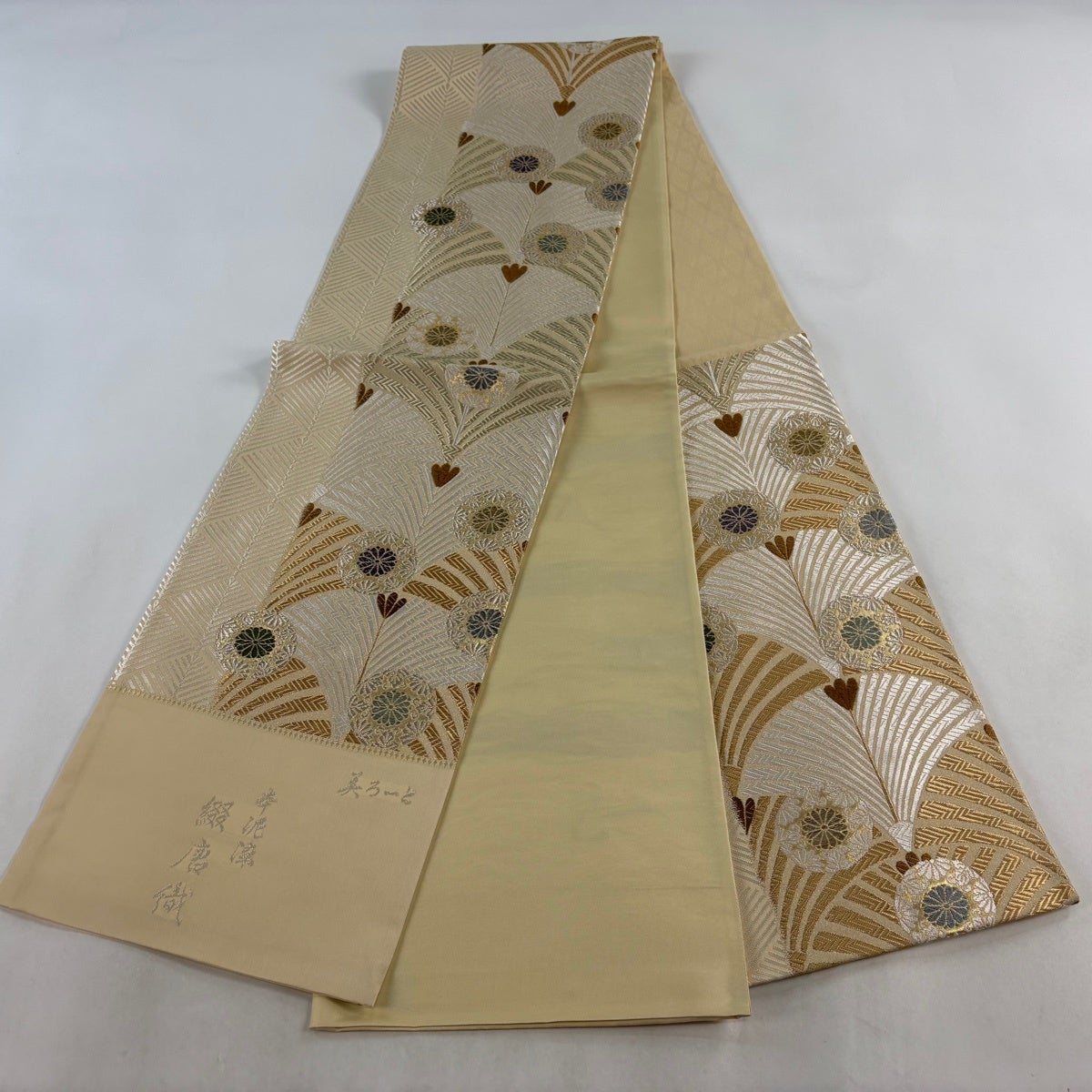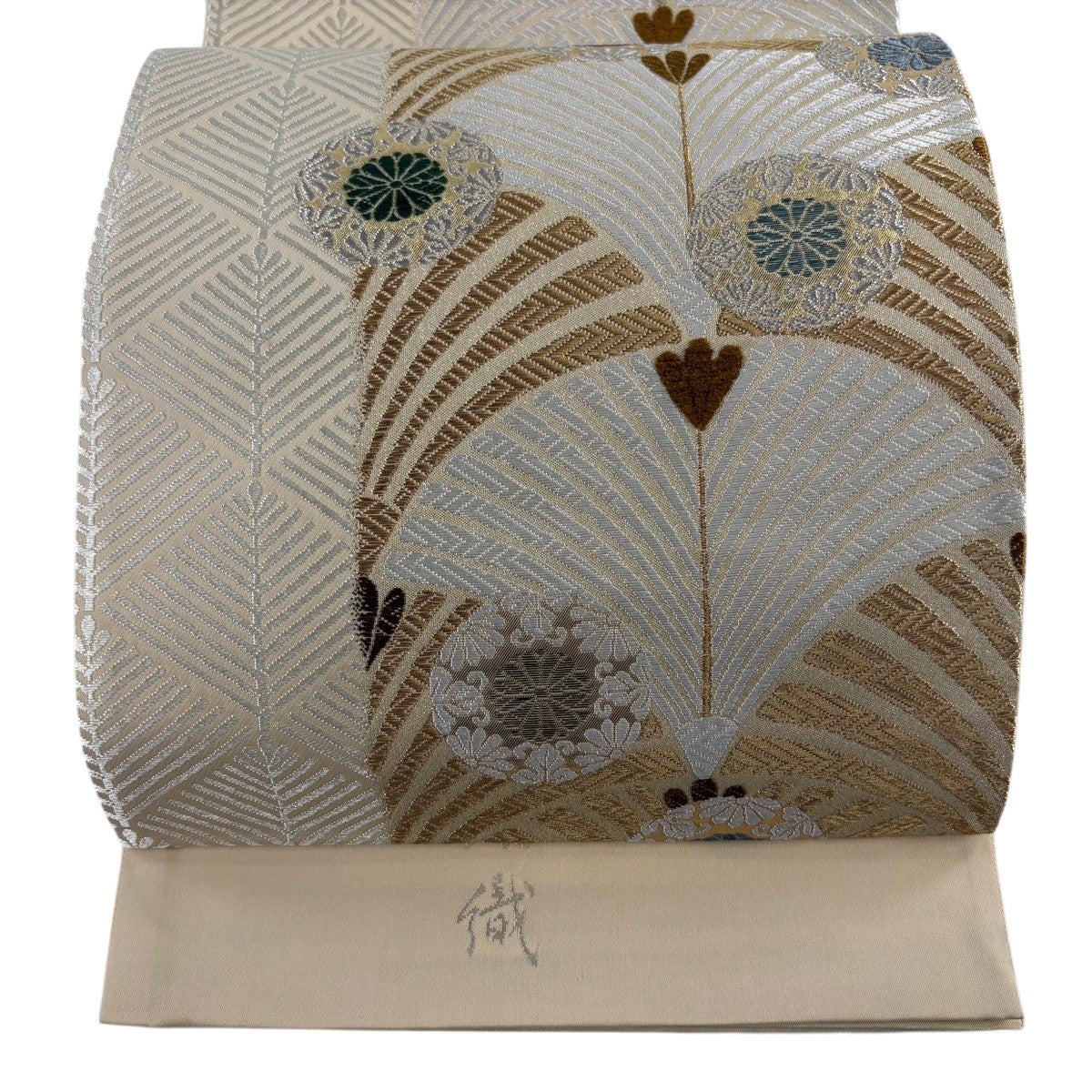 名古屋帯 秀品 関西仕立て 扇 有職文様 箔 金銀彩 クリーム 正絹