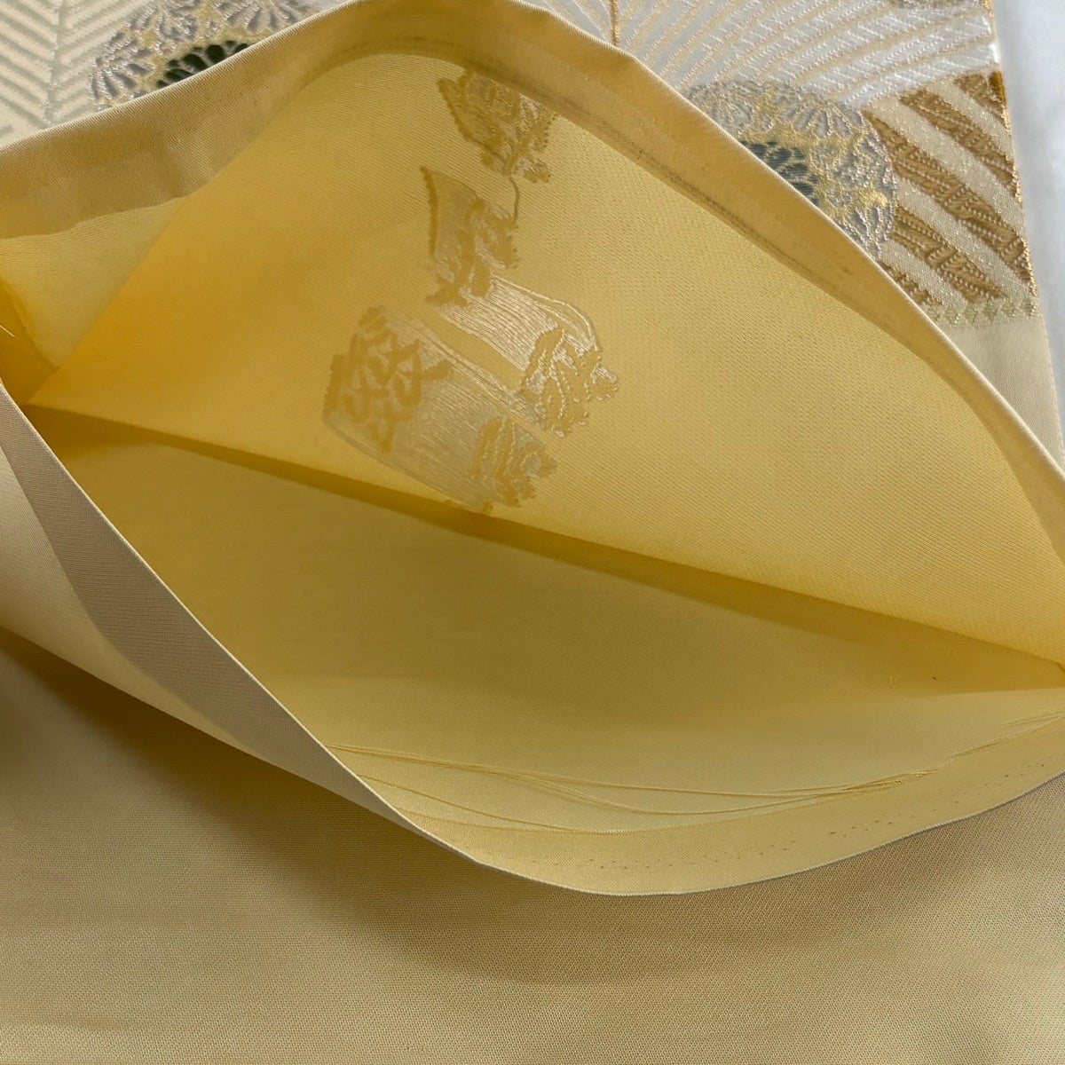 袋帯 秀品 関西仕立て 桧扇 草花 金糸 箔 クリーム 六通 正絹