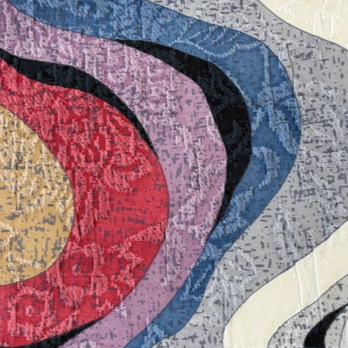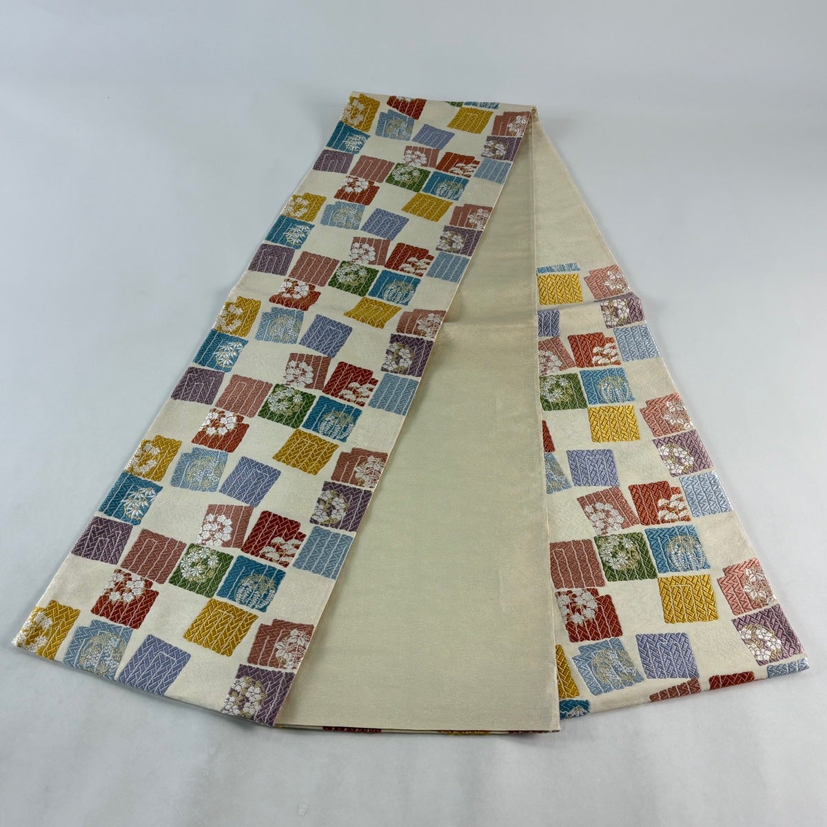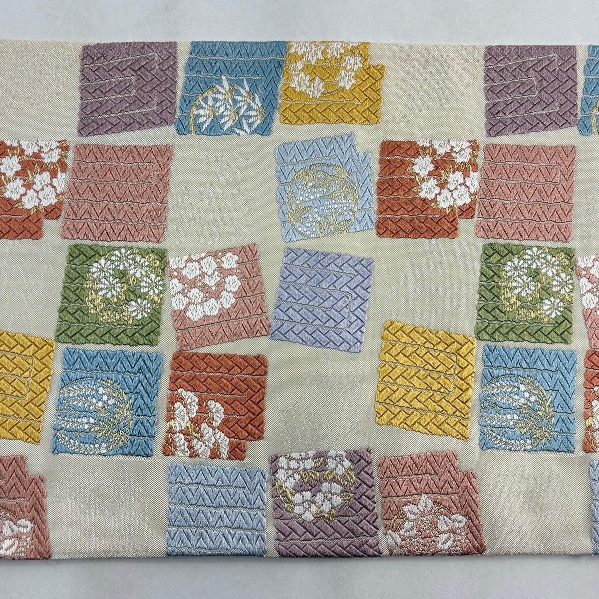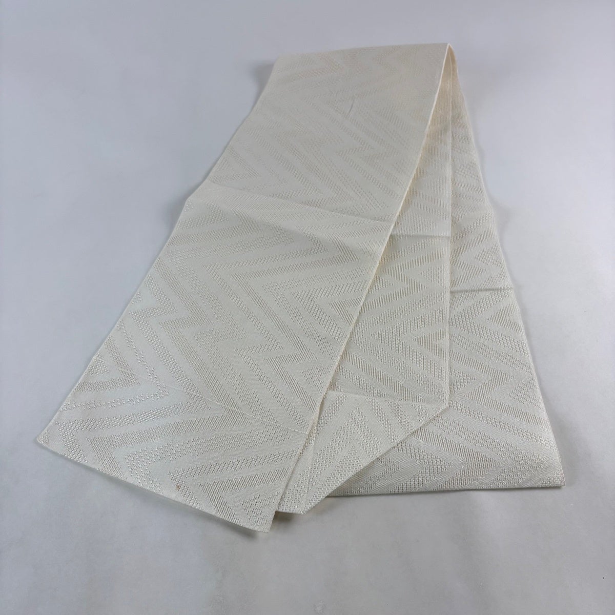 【美品】 袋帯 秀品 幾何学模様 地紋 膨れ織 クリーム 全通 正絹