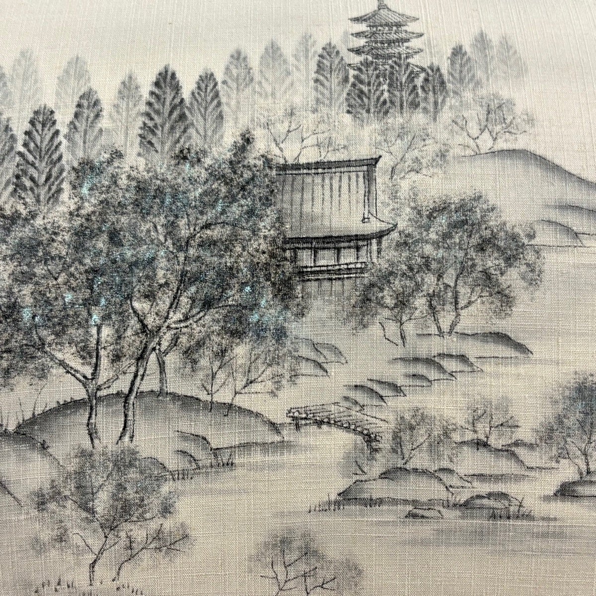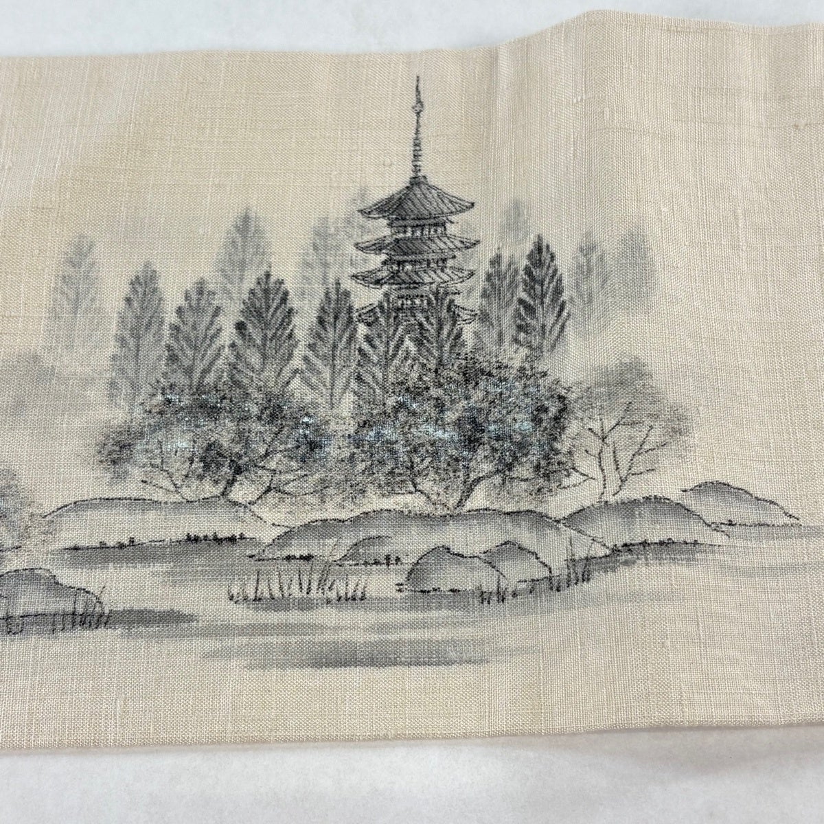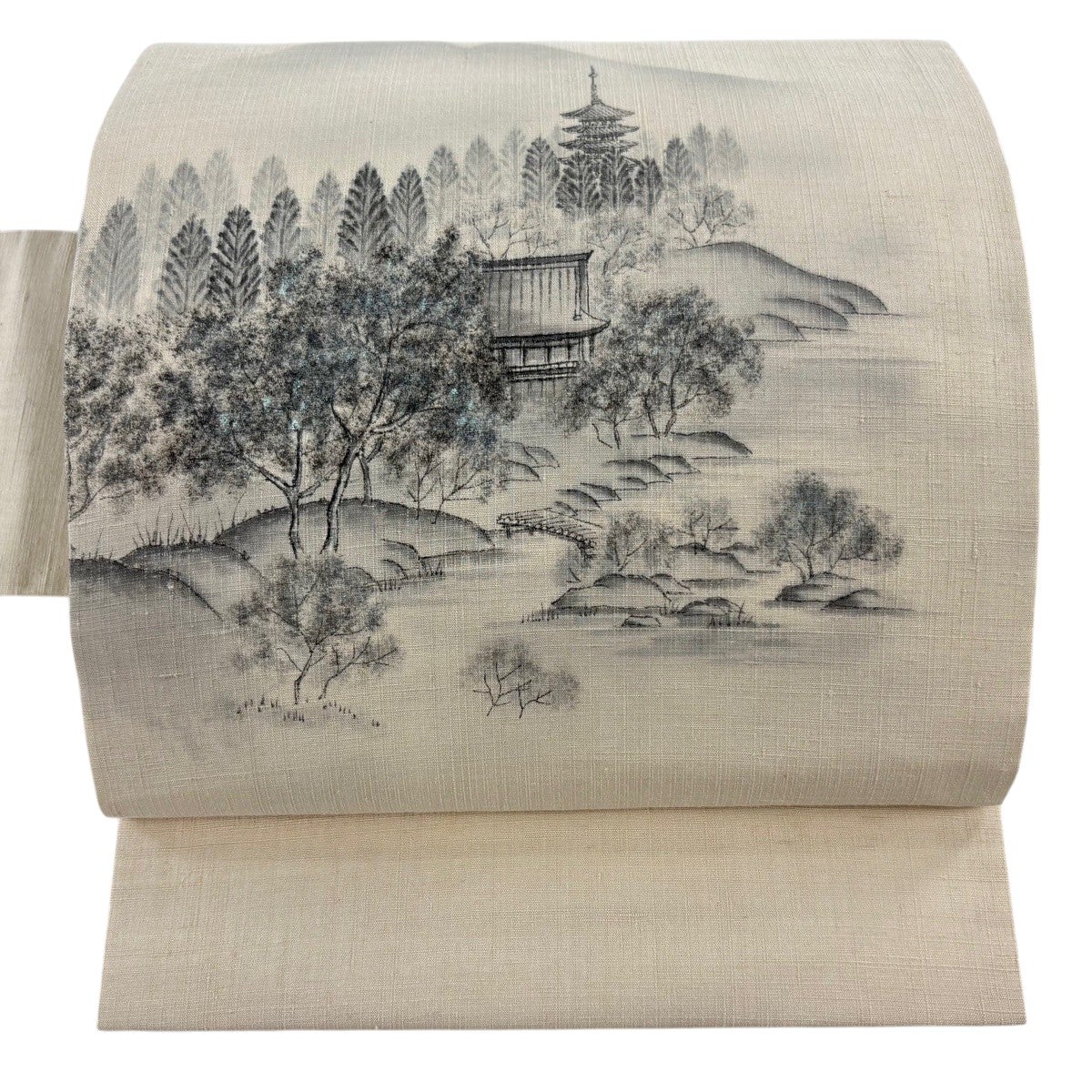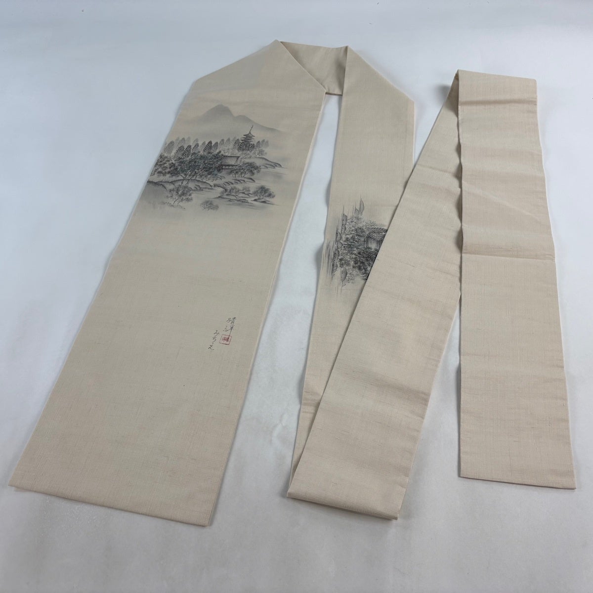 【美品】 名古屋帯 優品 落款あり 紬地 建物 風景 クリーム 正絹