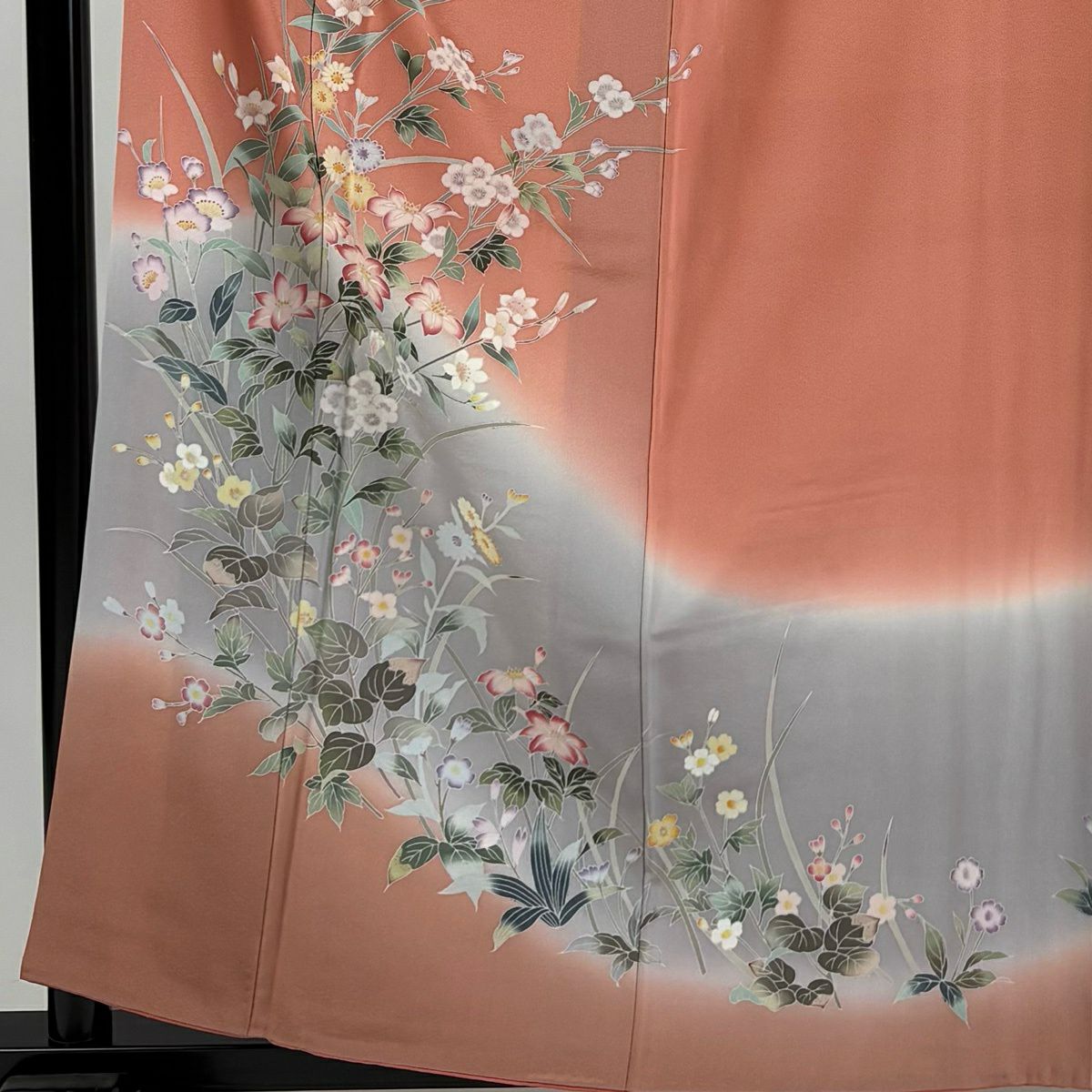 訪問着 身丈156cm 裄丈64cm M 袷 雪輪 草花 金銀彩 染め分け サーモンピンク 正絹 秀品