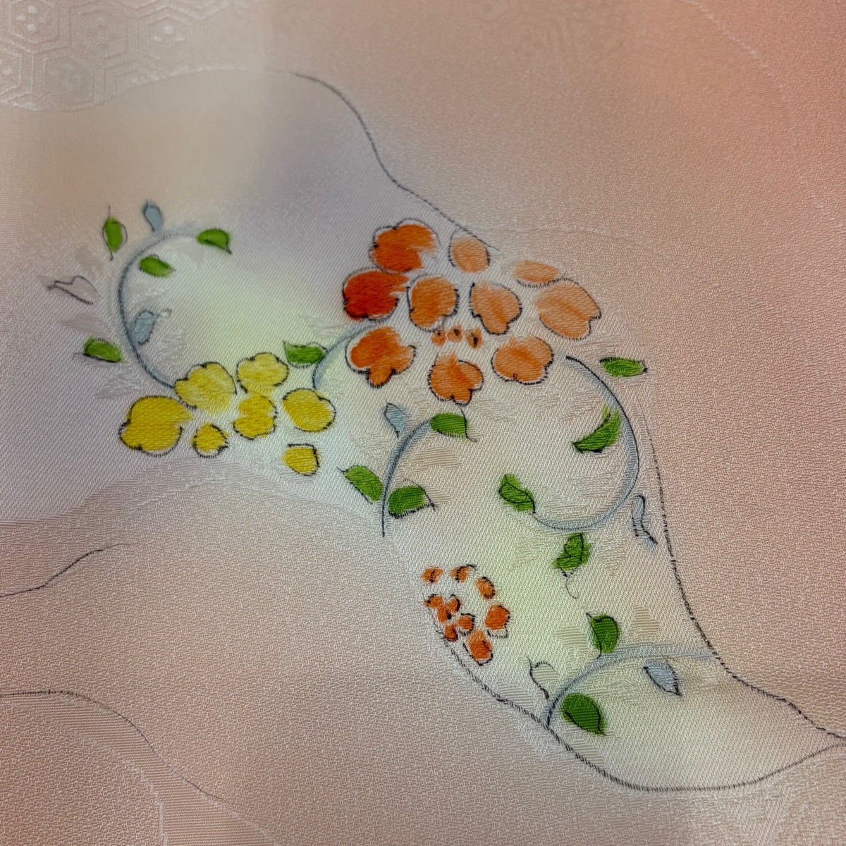 【美品】 小紋 身丈153cm 裄丈66.5cm M 袷 地紋起こし 草花 道長取 ぼかし サーモンピンク 正絹 優品