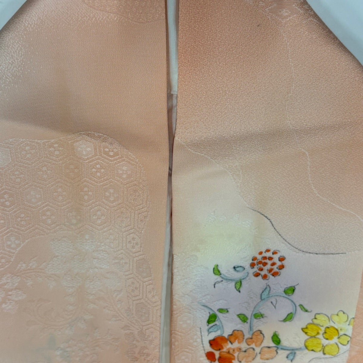 70%OFF 訪問着 身丈158cm 裄丈64cm M 袷 橘花 霞 刺繍 金糸 サーモンピンク 正絹 秀品 K70