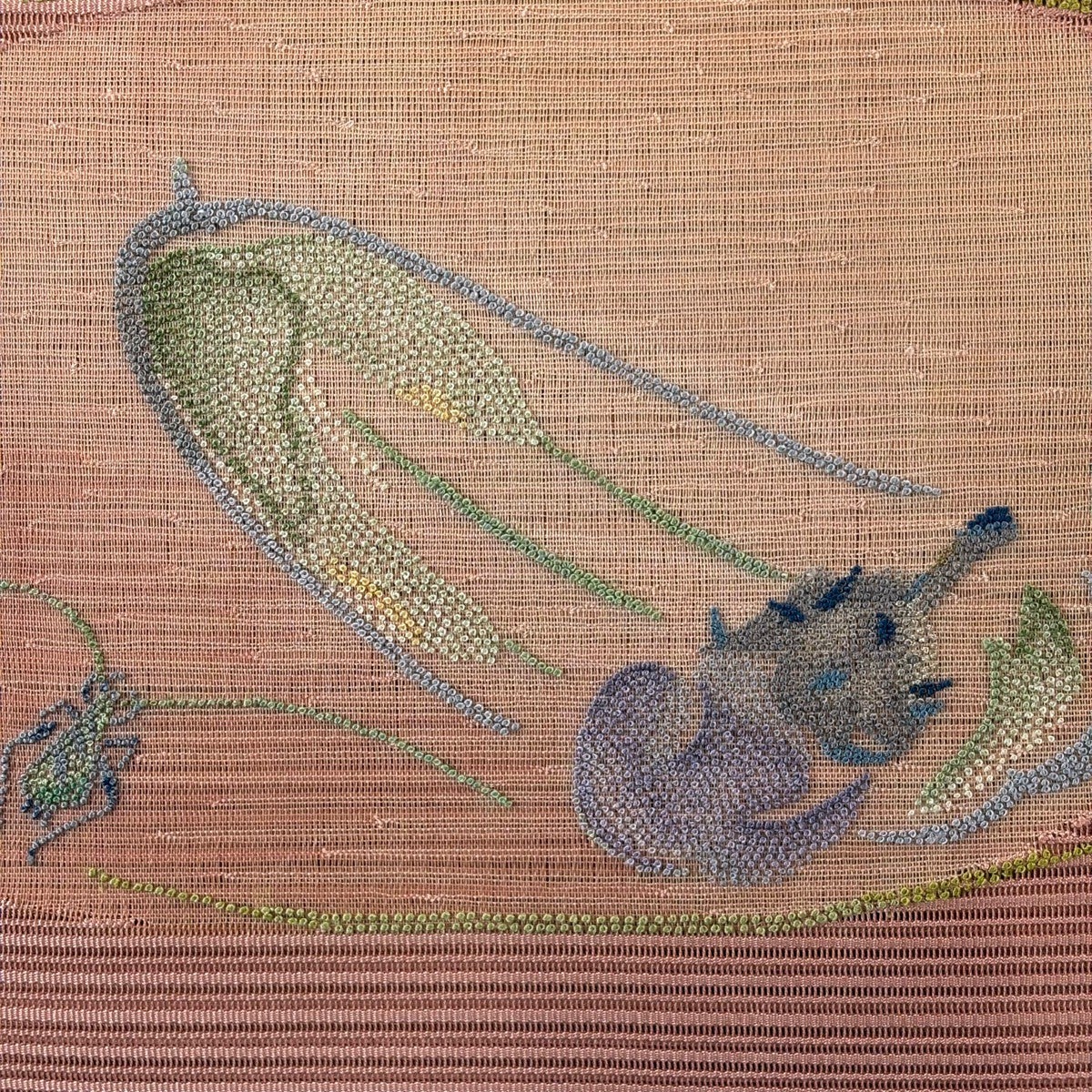 50%OFF 【美品】 袋帯 名品 じゅらく 落款あり 白菊秋草 金通し 箔 サーモンピンク お太鼓柄 正絹 K50