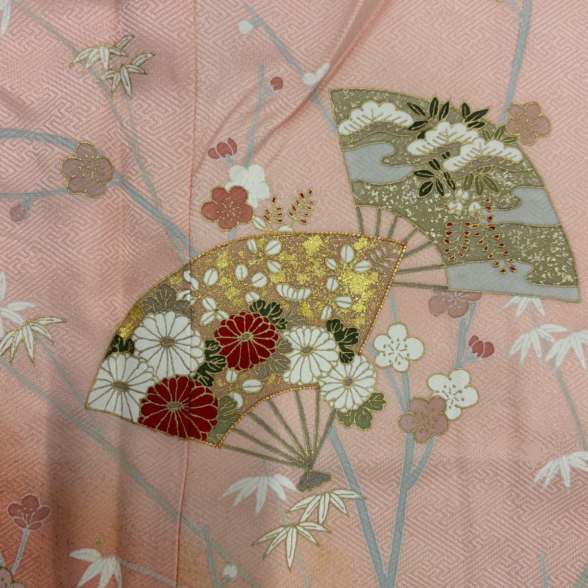 50%OFF 訪問着 身丈166cm 裄丈67cm M 袷 扇面 牡丹 金糸 金彩 サーモンピンク 正絹 秀品 K50