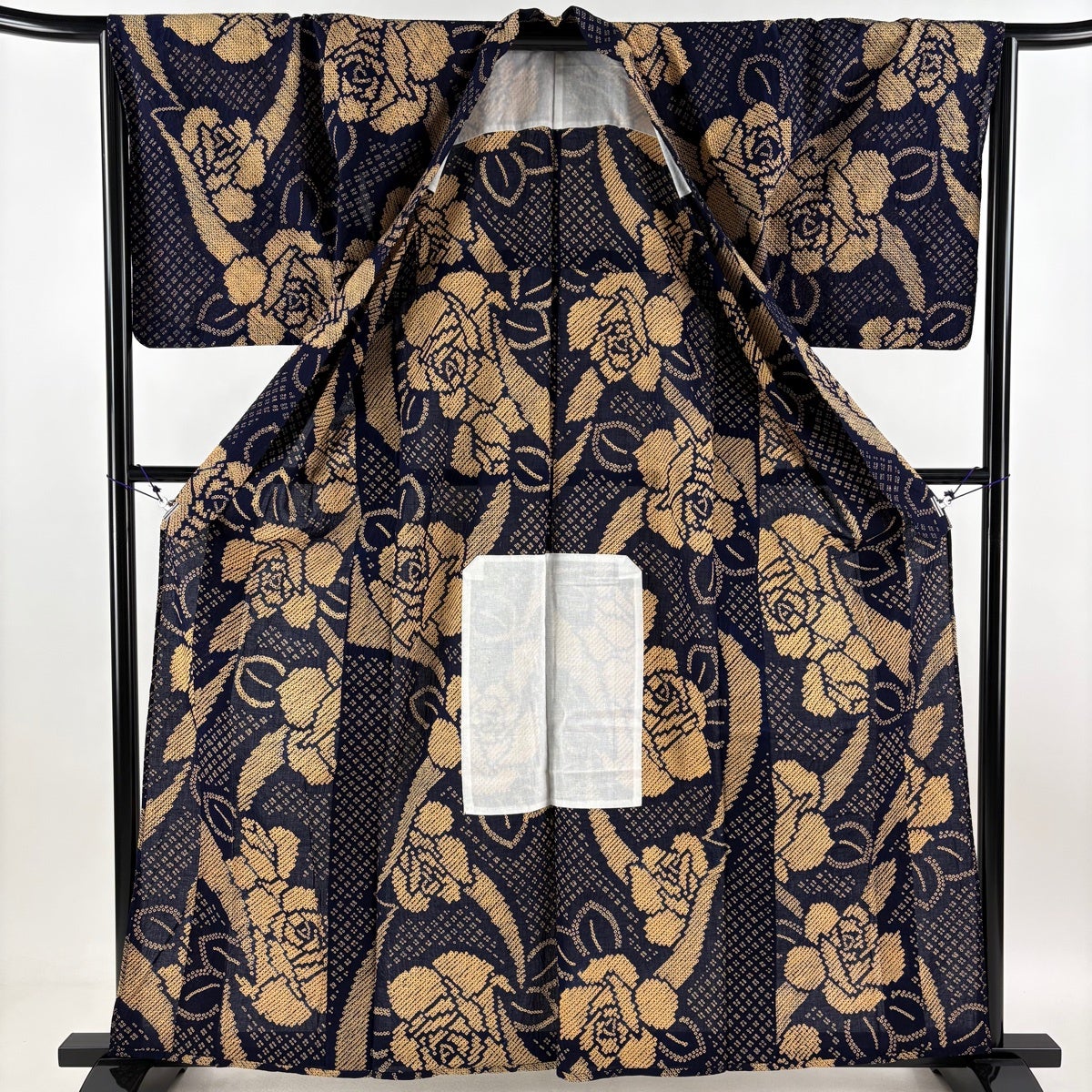 【美品】 浴衣 身丈162cm 裄丈66cm M 絞り浴衣 浴衣セット 薔薇 紺色 綿 名品