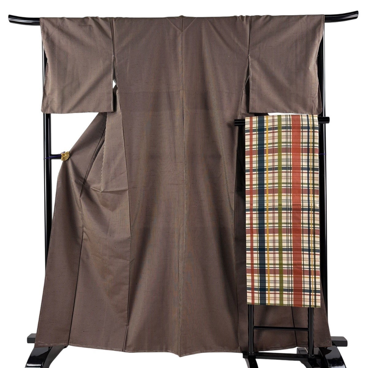 紬 身丈171.5cm 裄丈67.5cm L 袷 名古屋帯セット 雲文 格子 焦茶色 正絹 秀品