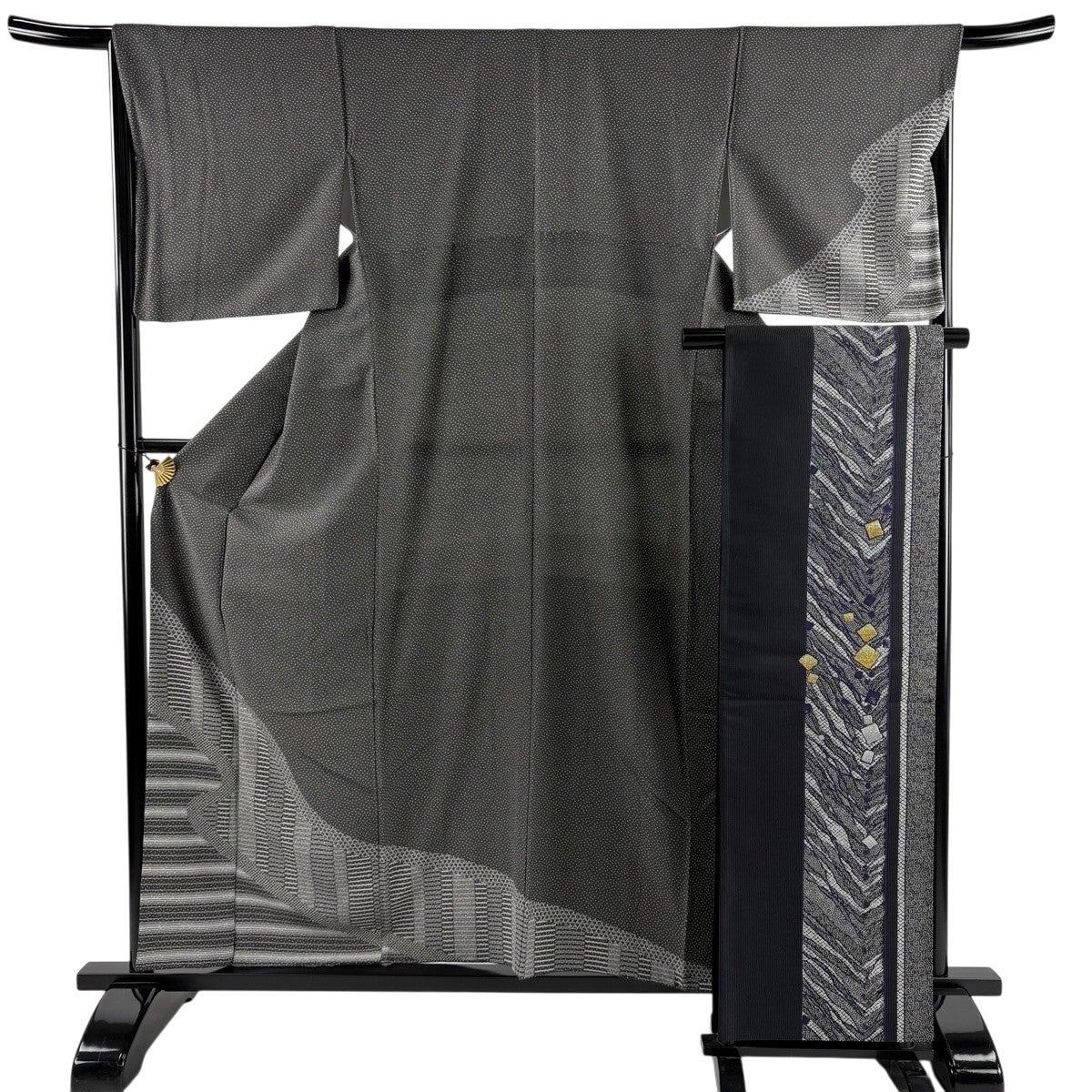 付下げ 身丈158.5cm 裄丈67cm M 袷 袋帯セット 縞 霞 黒灰 正絹 秀品