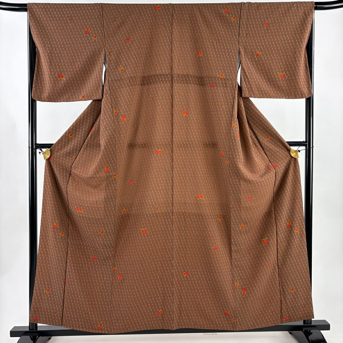【美品】 小紋 身丈164cm 裄丈64cm M 袷 袋帯セット 華文 地紋 茶色 正絹 秀品