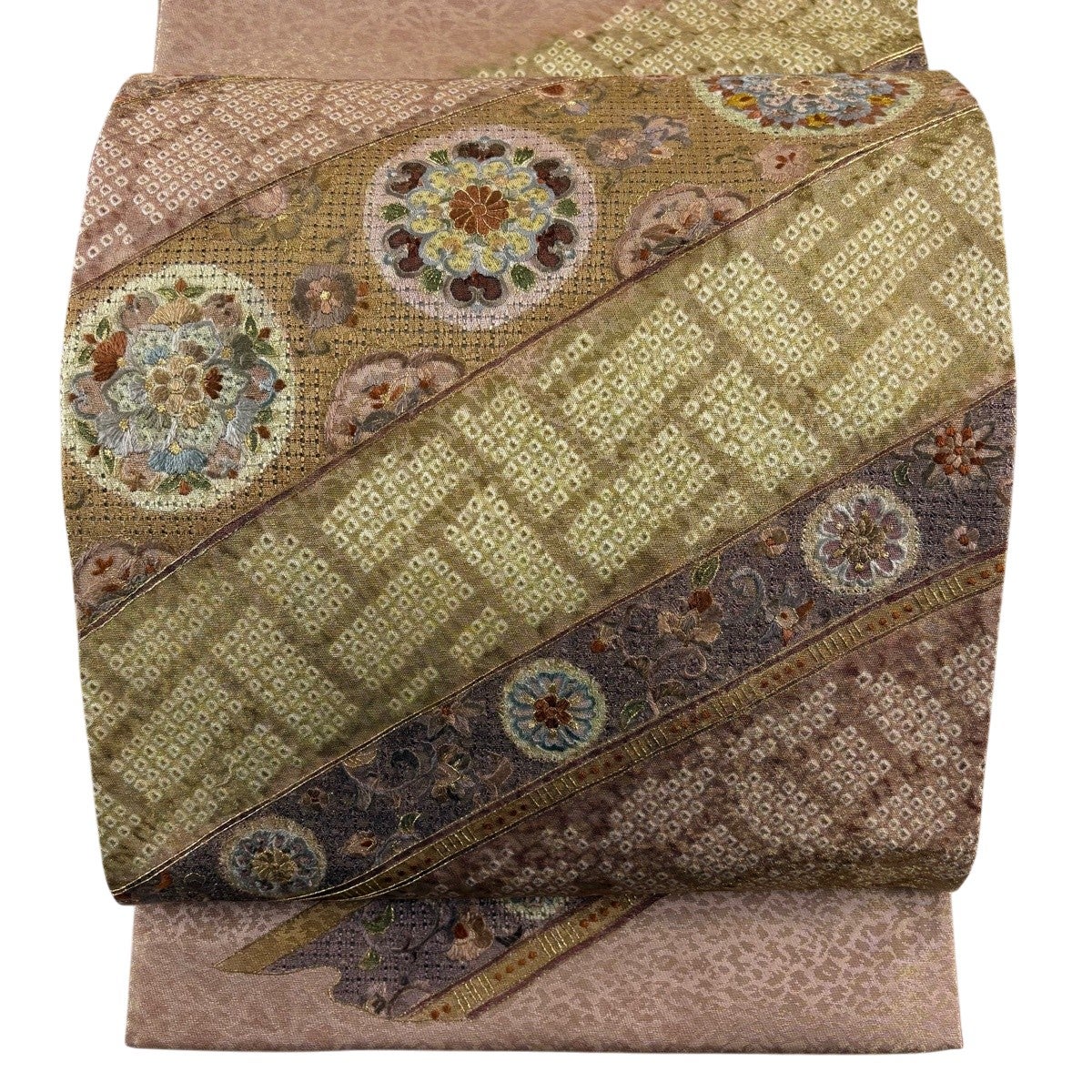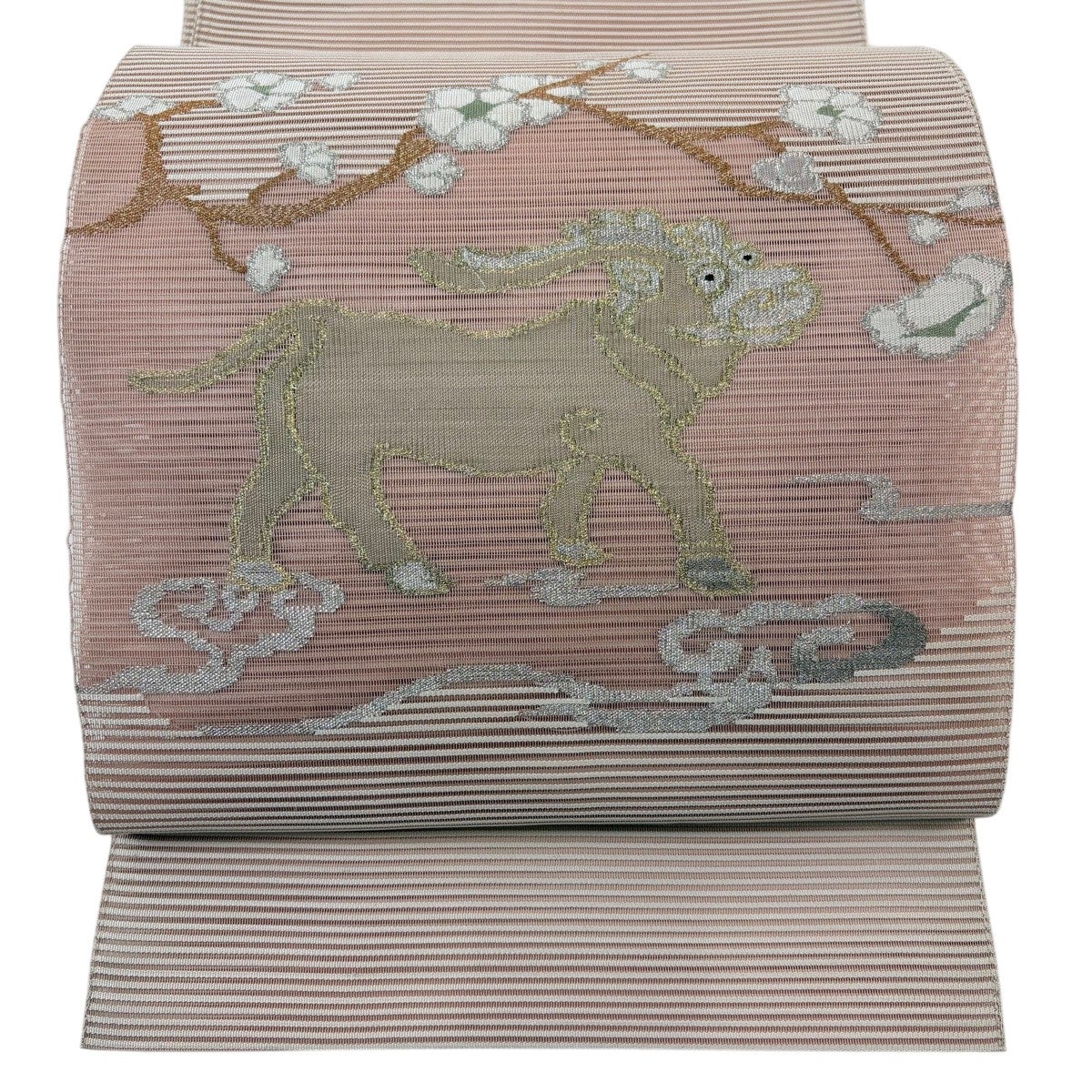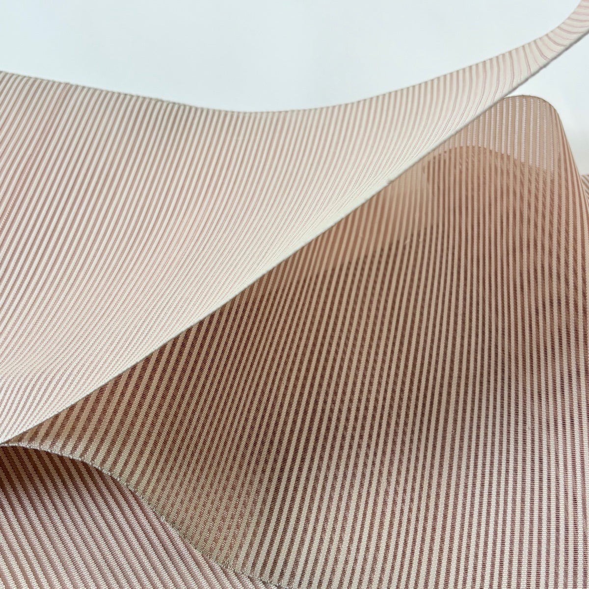 70%OFF 【美品】 袋帯 名品 縞 幾何学 金糸 ピンクベージュ お太鼓柄 正絹 K70