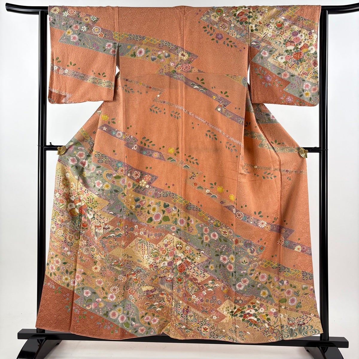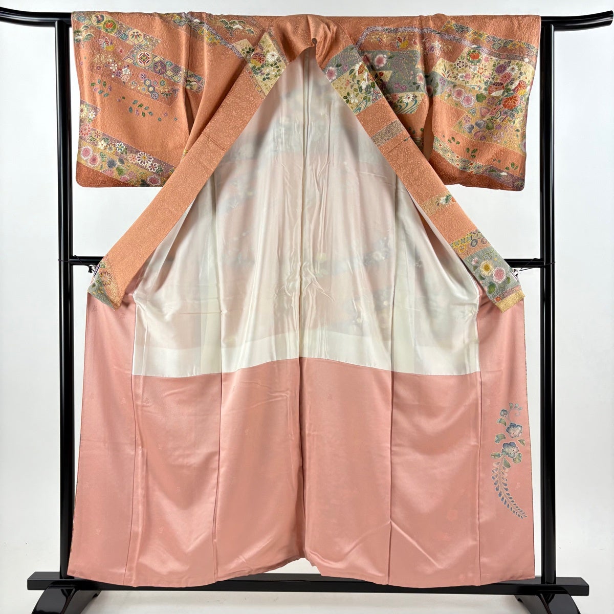 振袖 身丈170.5cm 裄丈66cm M 袷 建物 菊 金糸 金彩 ピンクベージュ 正絹 秀品