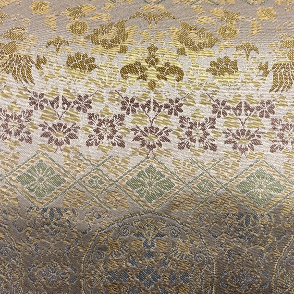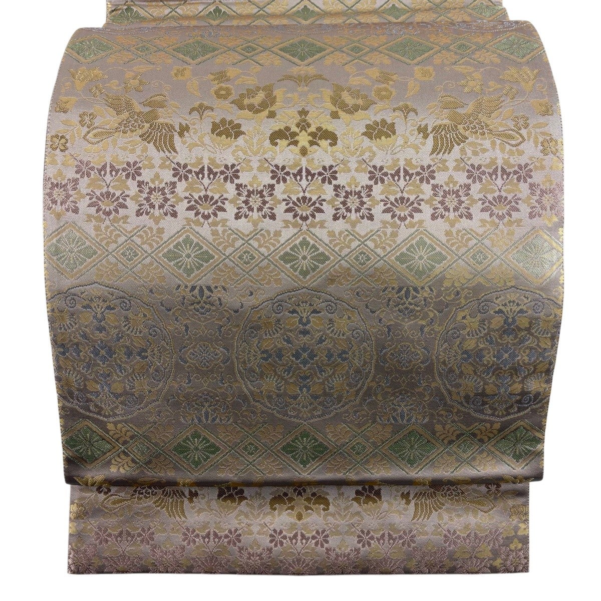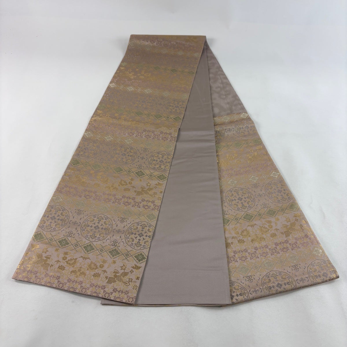 50%OFF 袋帯 秀品 関西仕立て 花喰い鳥 華文 箔 ピンクベージュ 六通 正絹 K50