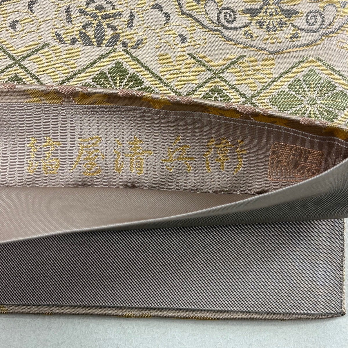 【美品】 袋帯 名品 箔屋清兵衛 落款あり 西陣織 花唐草 花鳥 箔 ピンクベージュ 六通 正絹