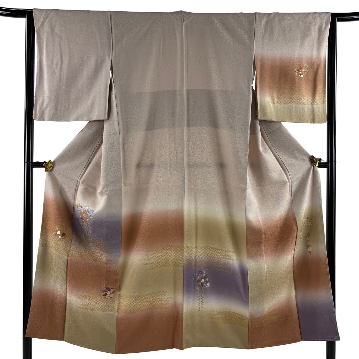 訪問着 身丈154.5cm 裄丈66cm M 袷 吾妻徳穂 落款あり 扇 草花 金糸 金彩 ピンクベージュ 正絹 秀品