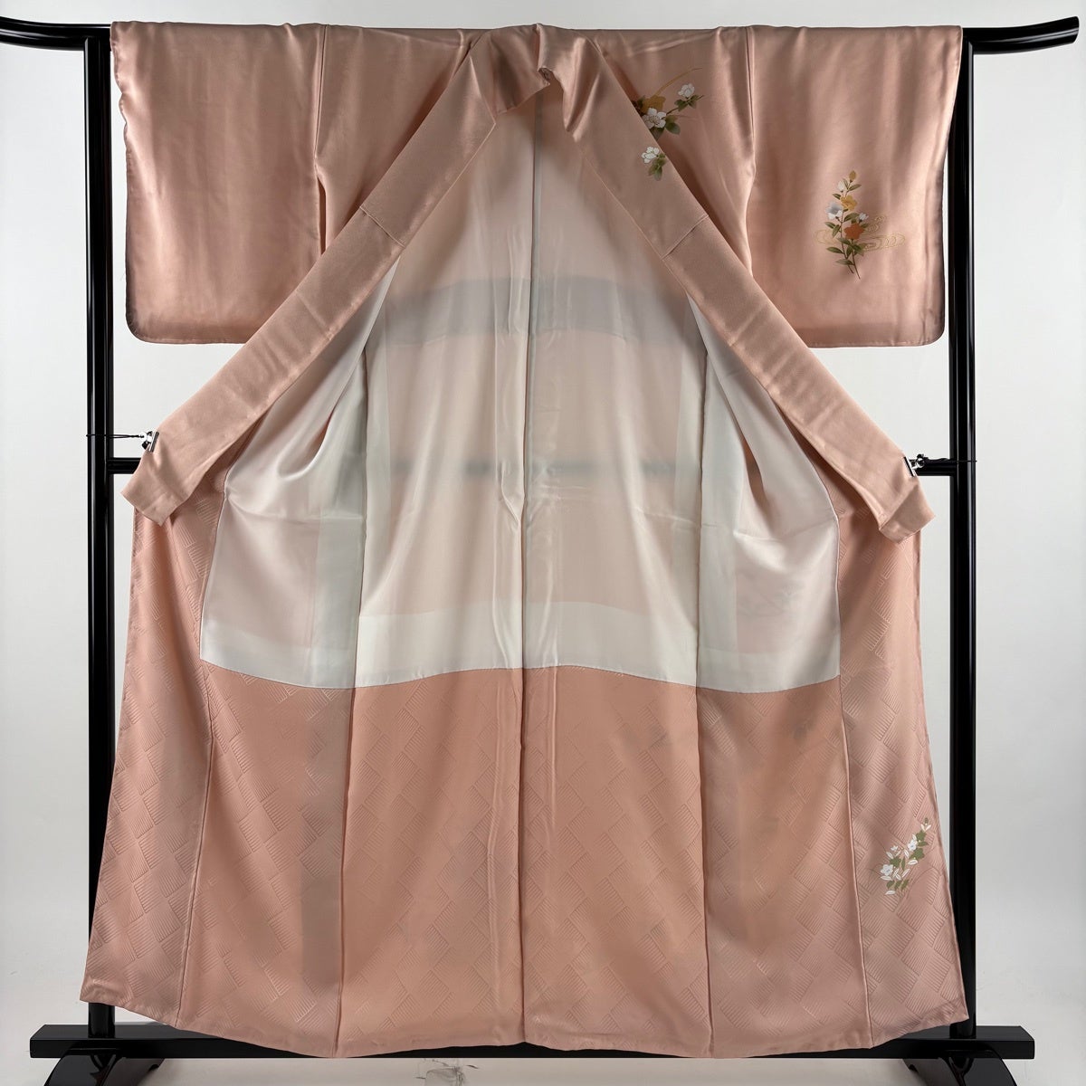 訪問着 身丈154.5cm 裄丈68cm L 袷 滝泰 落款あり 草花 ヱ霞 刺繍 絞り サーモンピンク 正絹 秀品