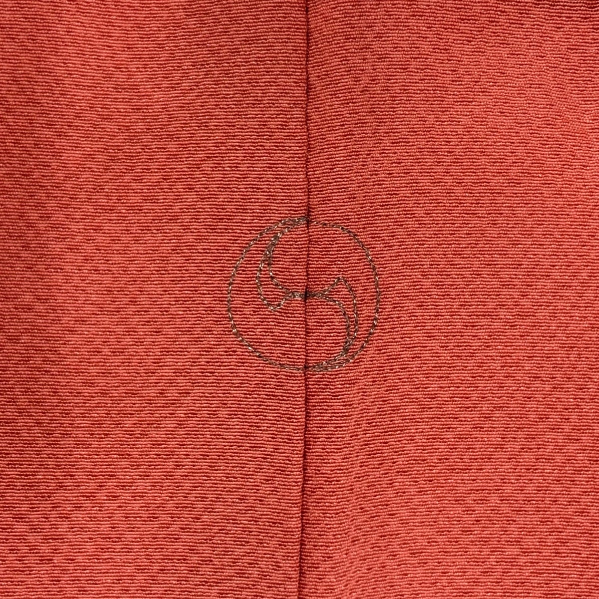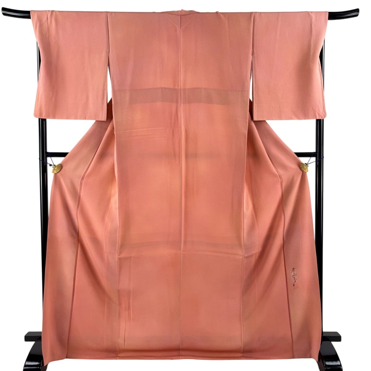 小紋 身丈172cm 裄丈67.5cm L 袷 斉藤三才 やまと 落款あり ぼかし柄 縮緬 サーモンピンク 正絹 秀品